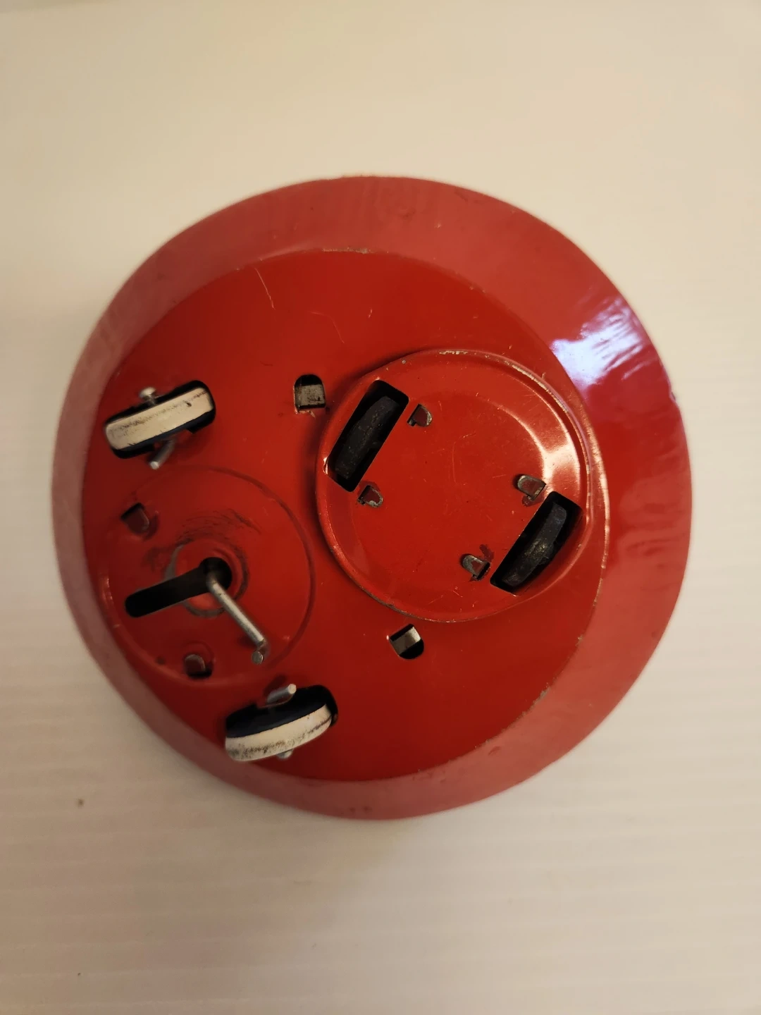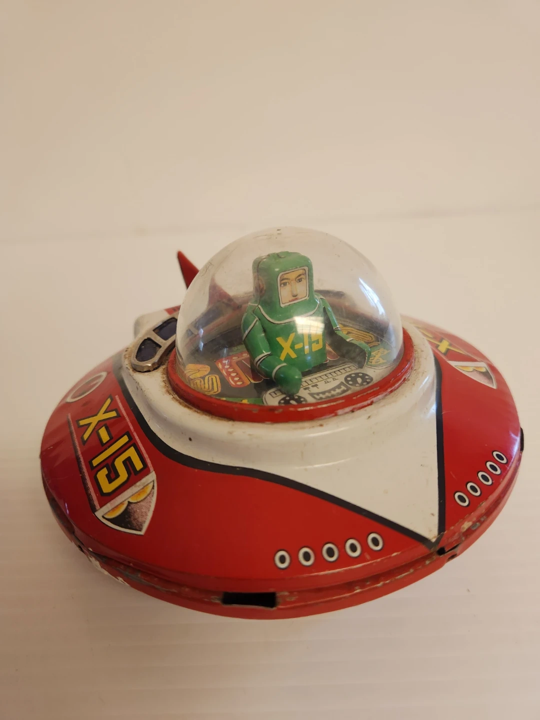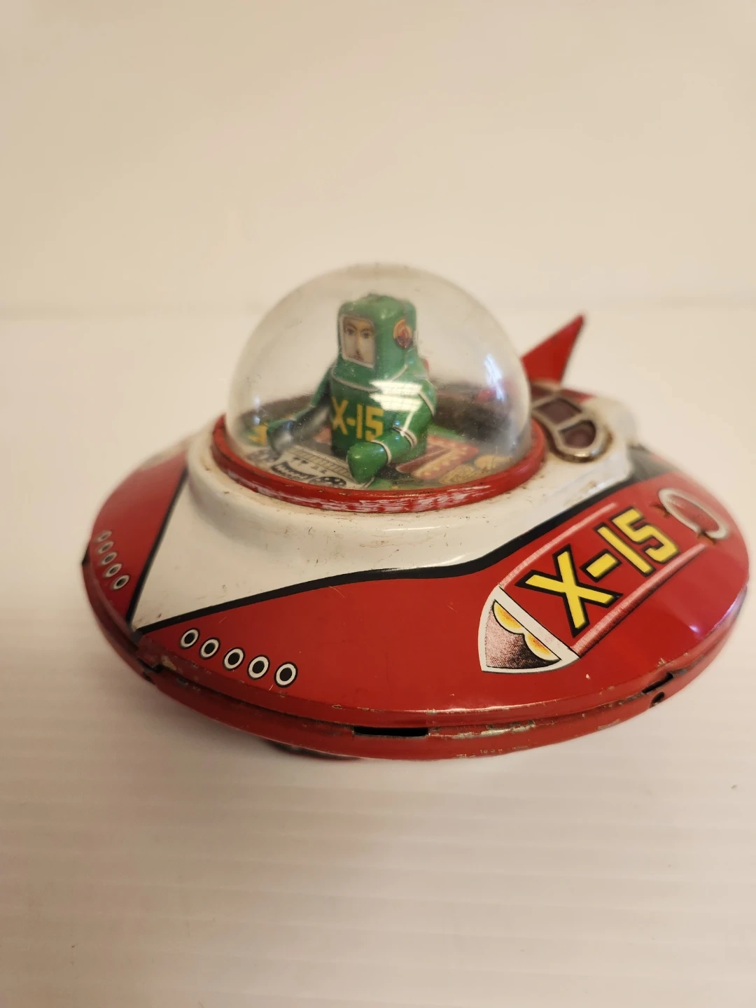 This is a vintage X-15 tin litho flying saucer toy. It features a clear dome with a green astronaut figure inside. The toy is primarily red and white with black accents and "X-15" . Wind-up toy with mechanisms on the bottom.