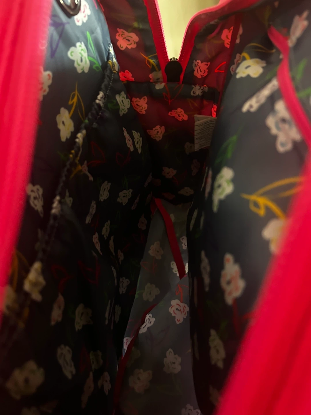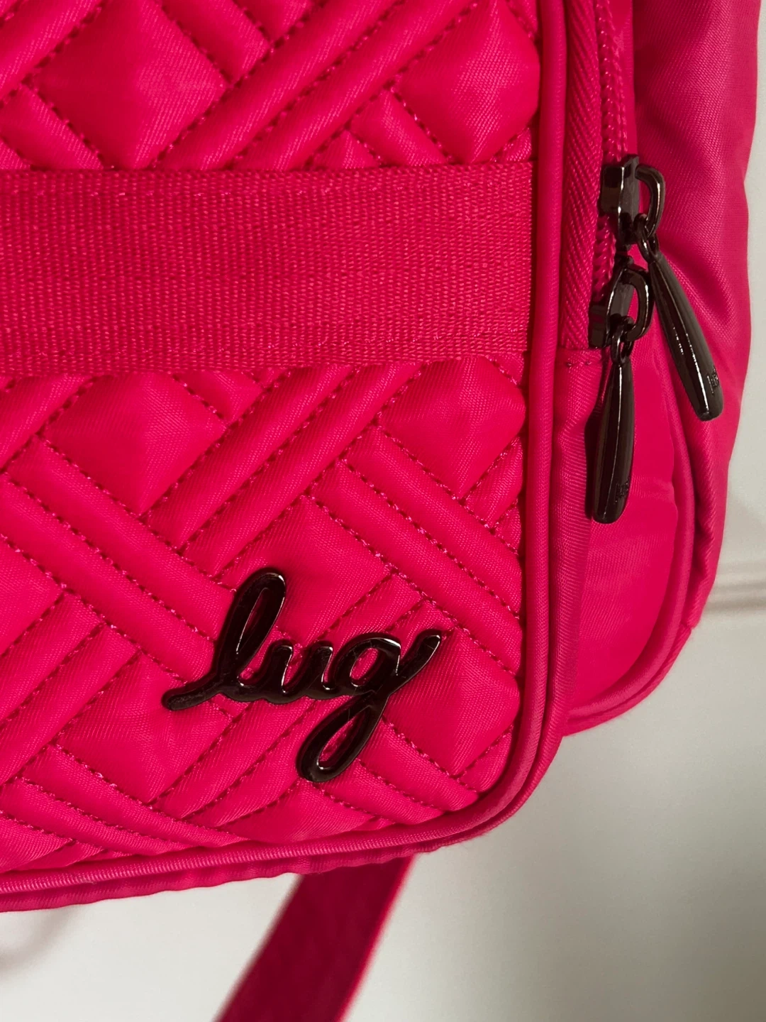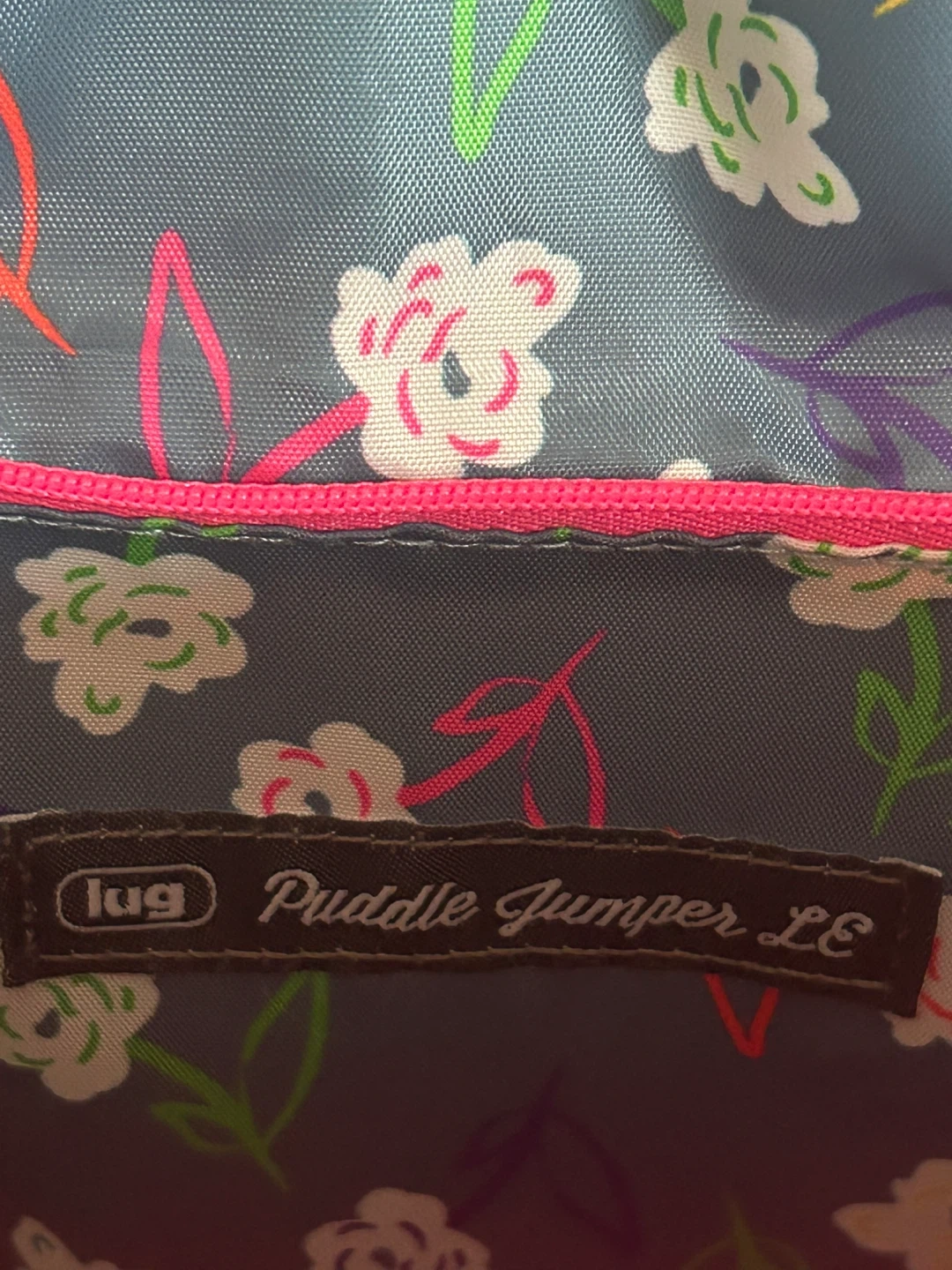 This is a Lug Puddle Jumper LE duffel bag in a bright hot pink colour. It features multiple zippered pockets and a fun floral print interior lining. It's a versatile bag for travel or everyday use!