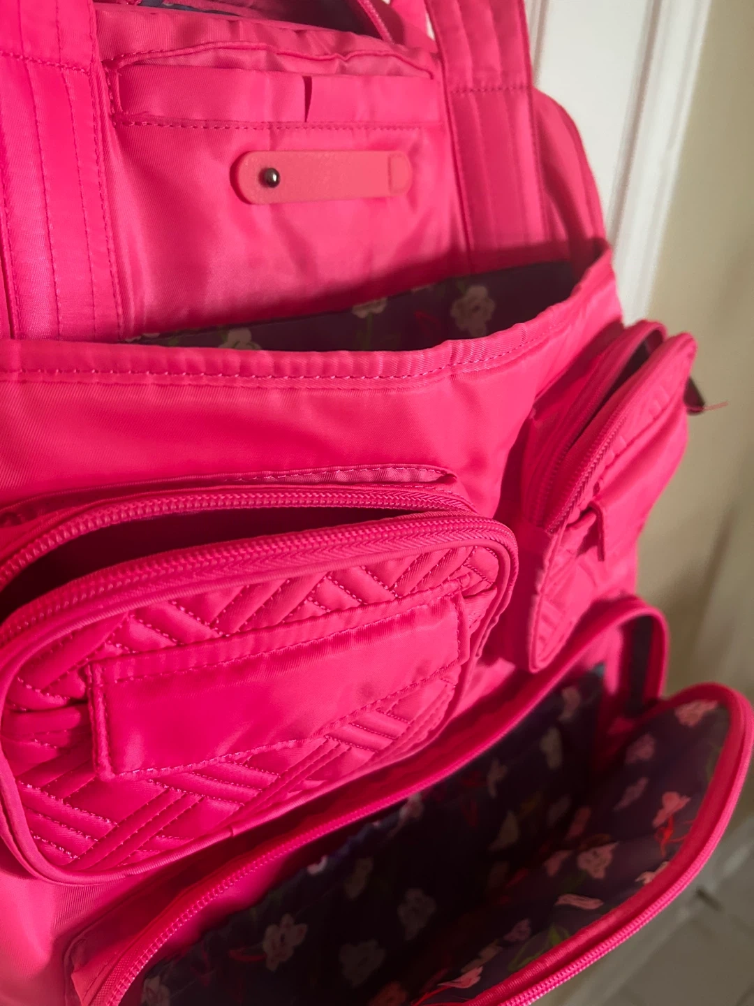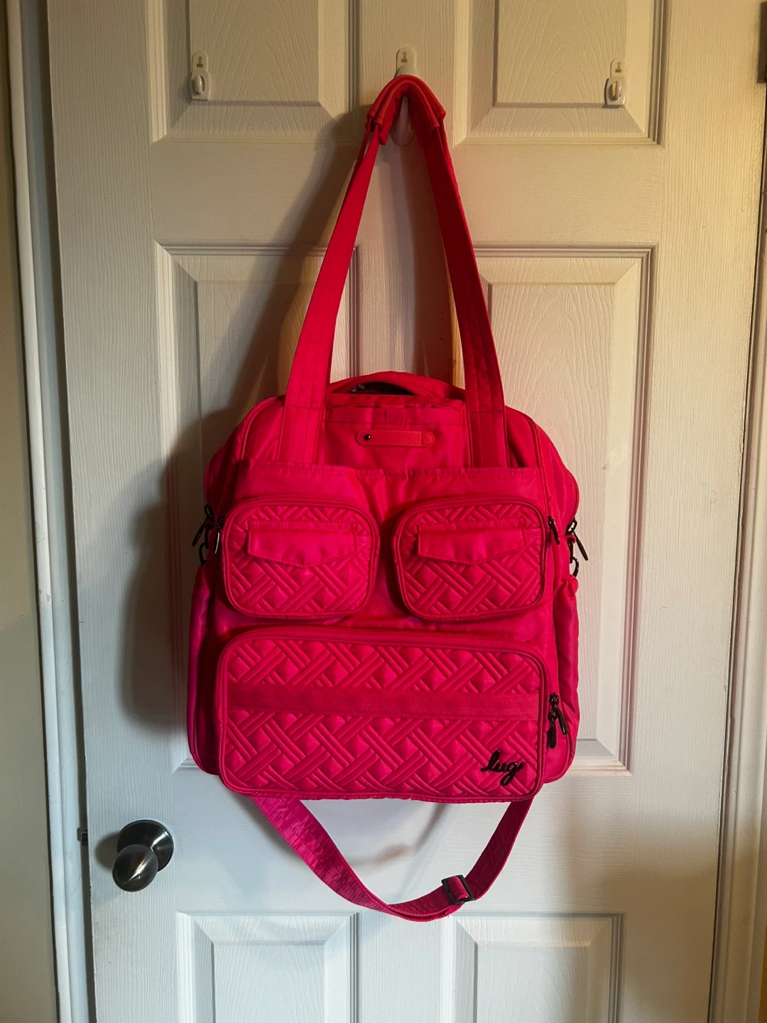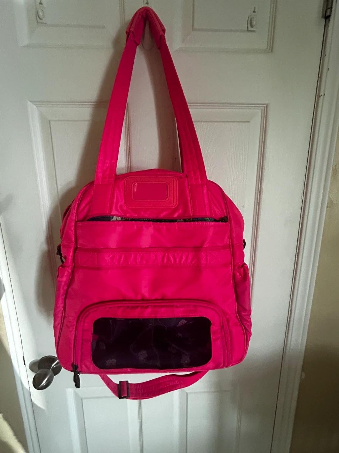 This is a Lug Puddle Jumper LE duffel bag in a bright hot pink colour. It features multiple zippered pockets and a fun floral print interior lining. It's a versatile bag for travel or everyday use!