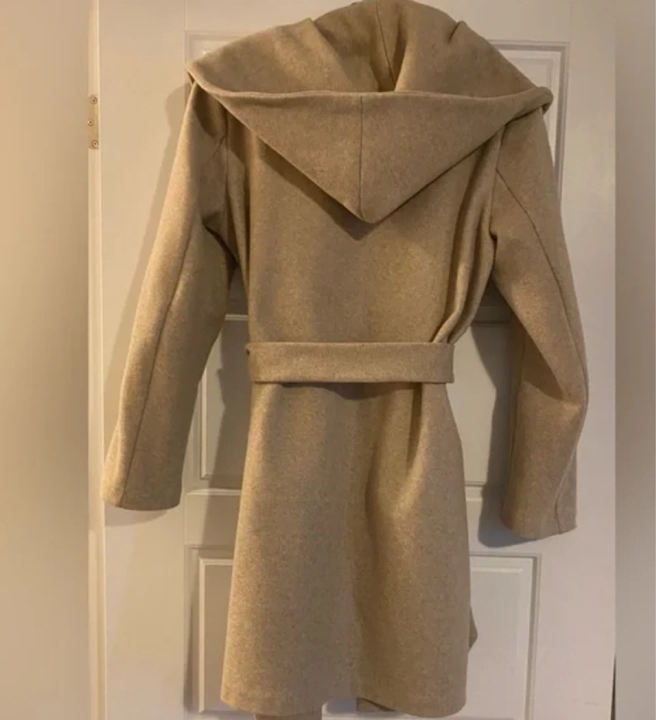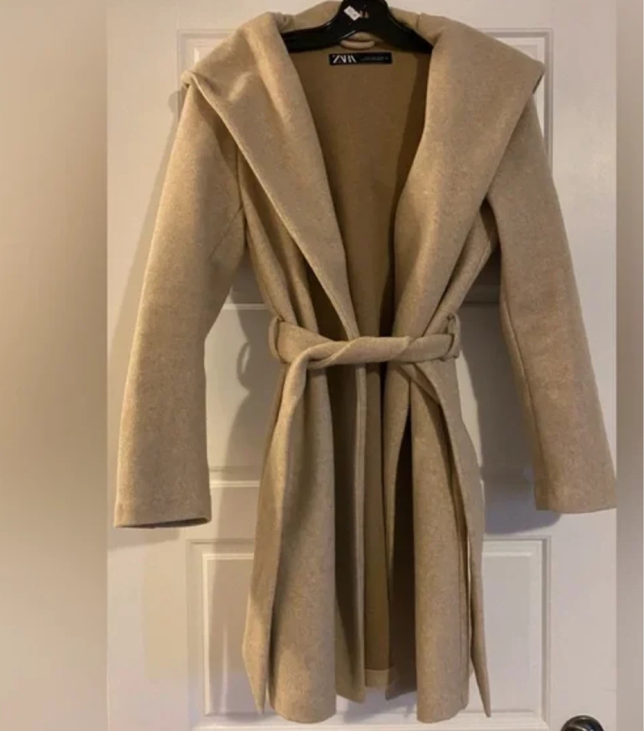 ZARA women's hooded coat in a lovely tan colour. It's a size medium and features a tie belt for a cinched waist. Perfect for cooler days!