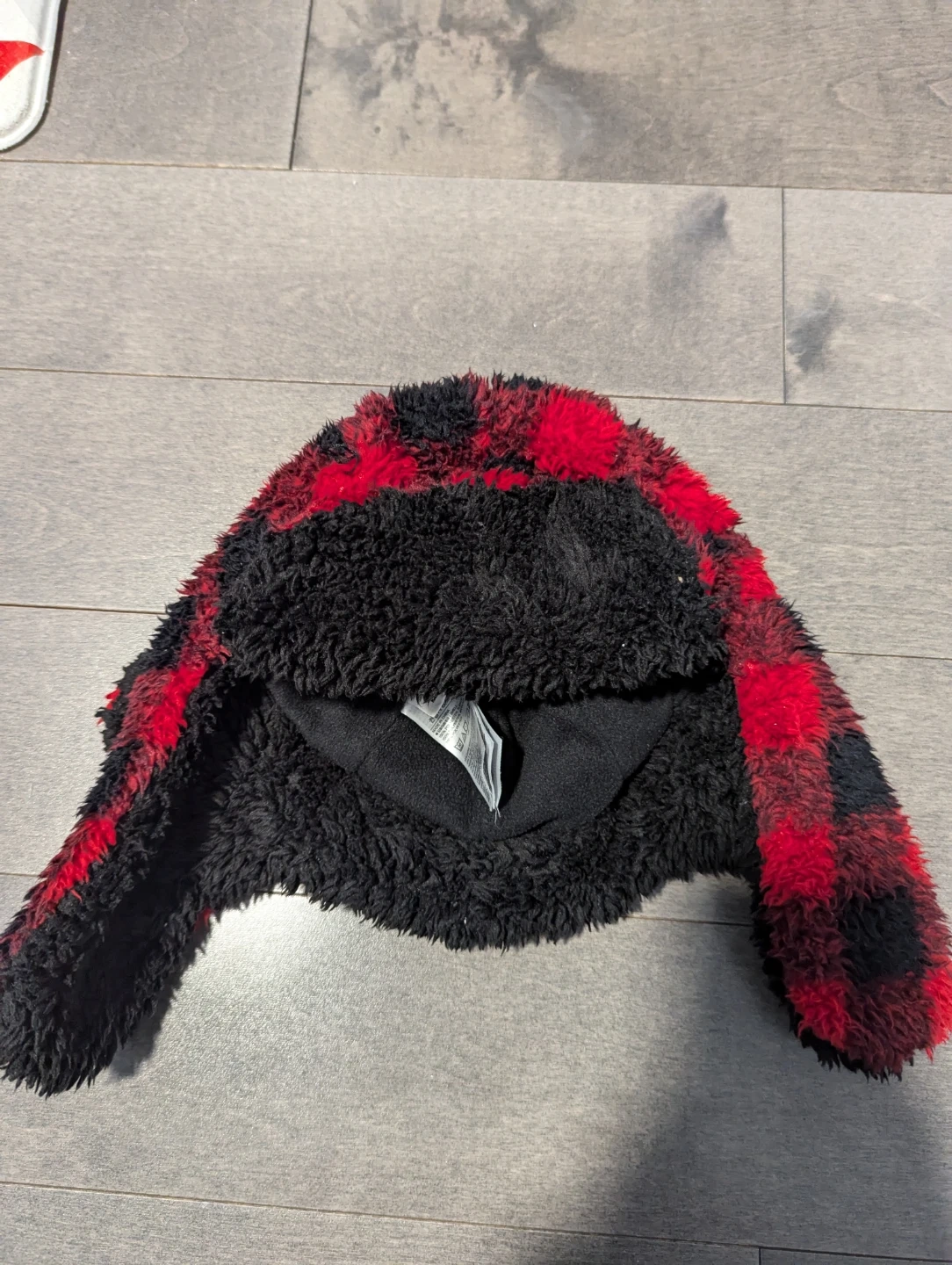 Cozy Gap Kids trapper hat in a red and black buffalo plaid pattern. It's made with a fuzzy shell and fleece lining for extra warmth. Size S/M, 52-54cm.