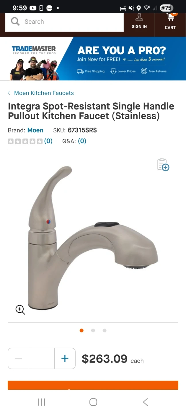 Selling a Moen Integra kitchen faucet in spot resist stainless. Model number is 67315SRS. It comes with a 1-handle high arc pulldown spout. New in box