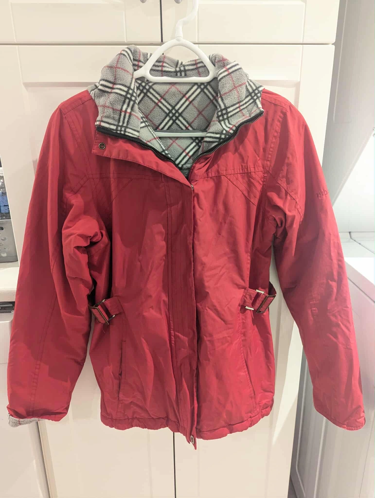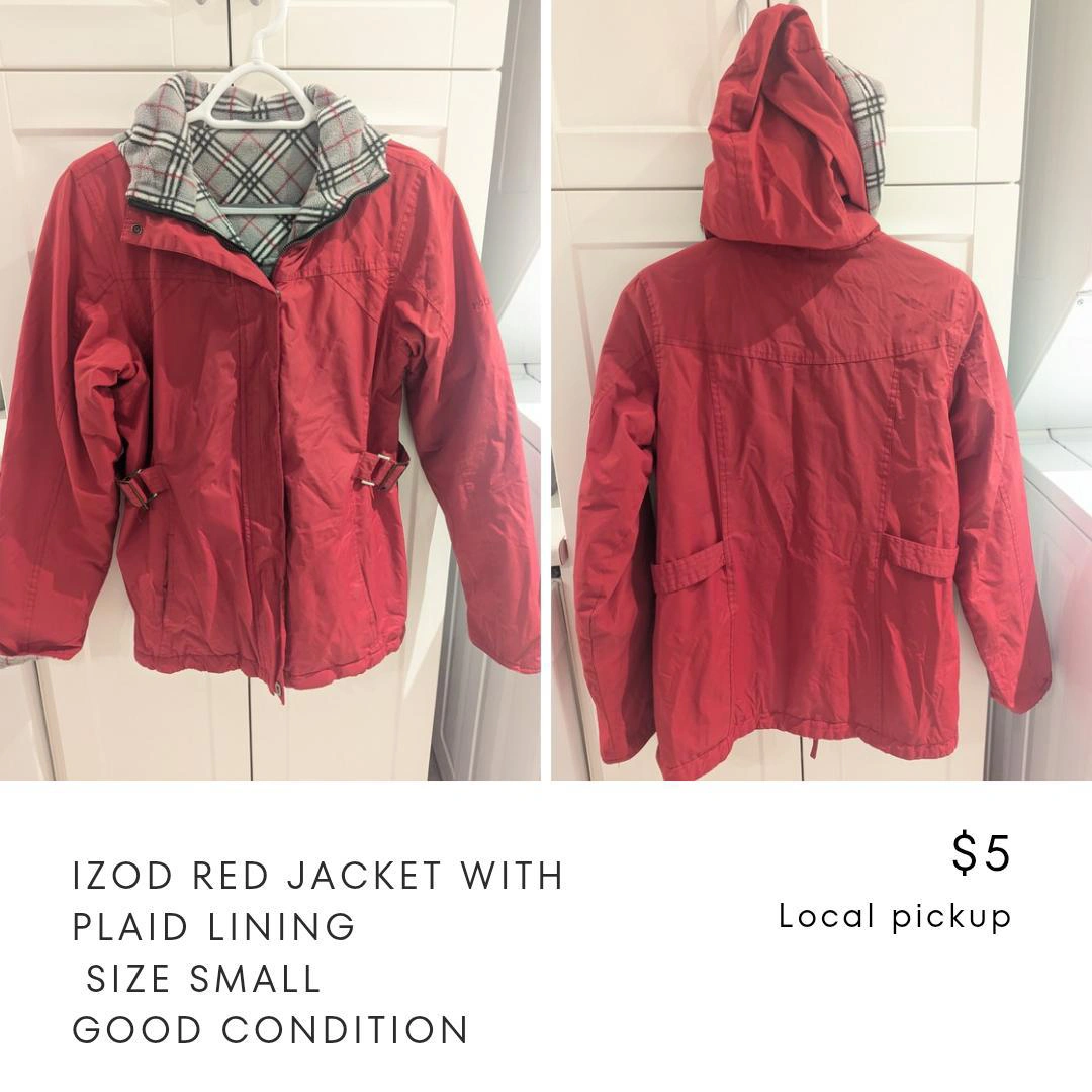 Selling a gently used IZOD red jacket with a stylish plaid lining. It's a size small and in good condition. Perfect for adding a pop of colour to your wardrobe!