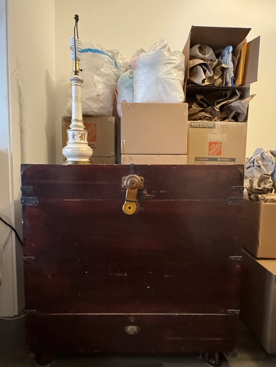 Large trunk with a small drawer on bottom and compartment in the lid. Solid, sturdy wood - heavy item. Good antique condition, but has some scratches and other imperfections (bottom drawer isn’t easy to open/close, and the inner lid compartment closure hook doesn’t quite reach its eye). Was almost definitely used for its original purpose back in the day (shipping/traveling). I’ve used it to store bagged clothes and as a side table in my living room. It’s on wheels that are rusted, so I set it on furniture sliders and move it around that way - I can include those sliders for you.