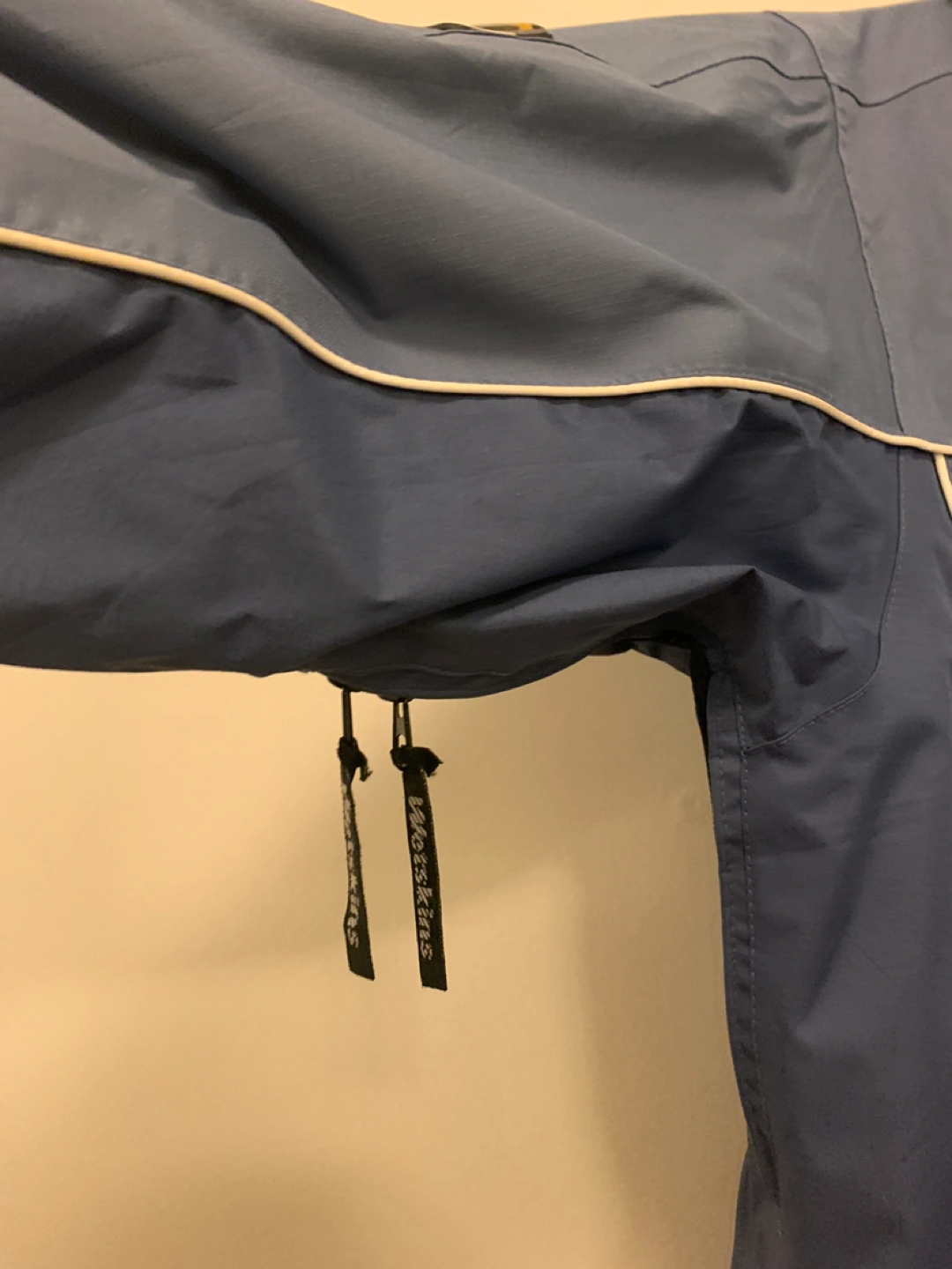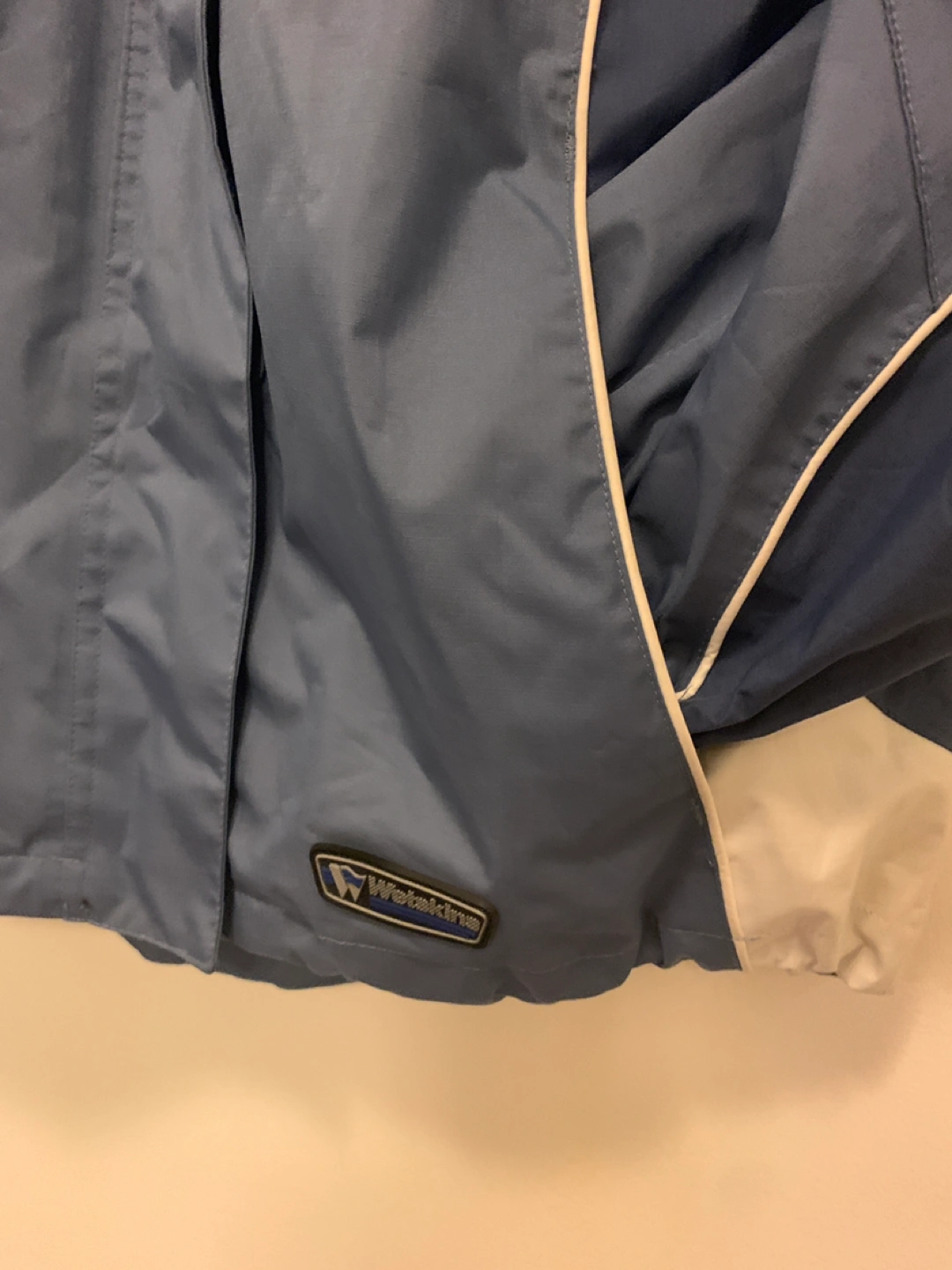 Blue/white rain jacket. Has vented under arms and plenty of pockets (including really cool reverse zippers)!