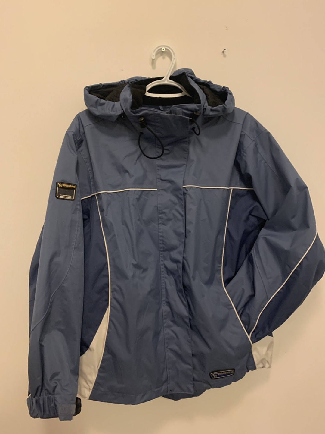 Blue/white rain jacket. Has vented under arms and plenty of pockets (including really cool reverse zippers)!