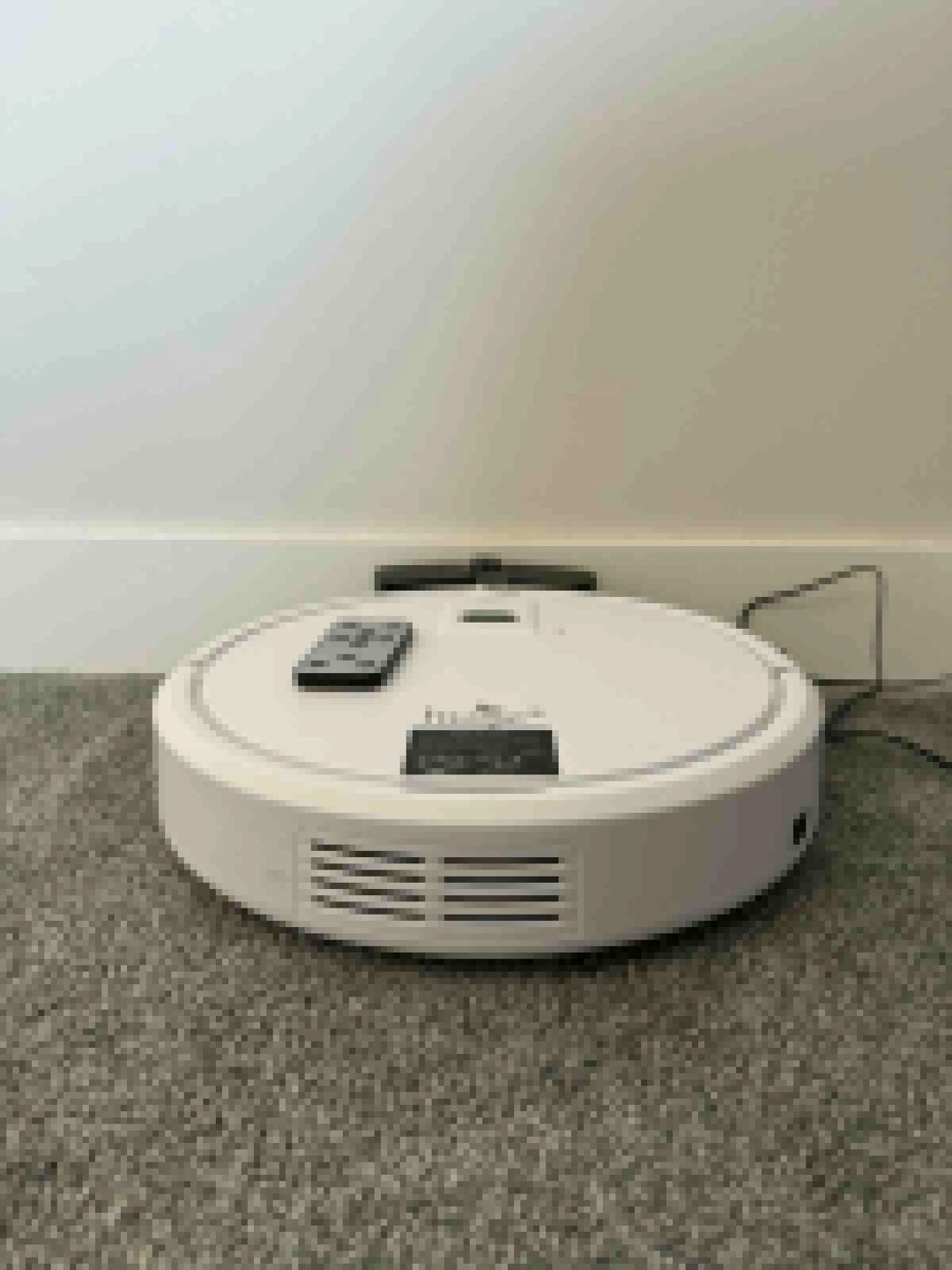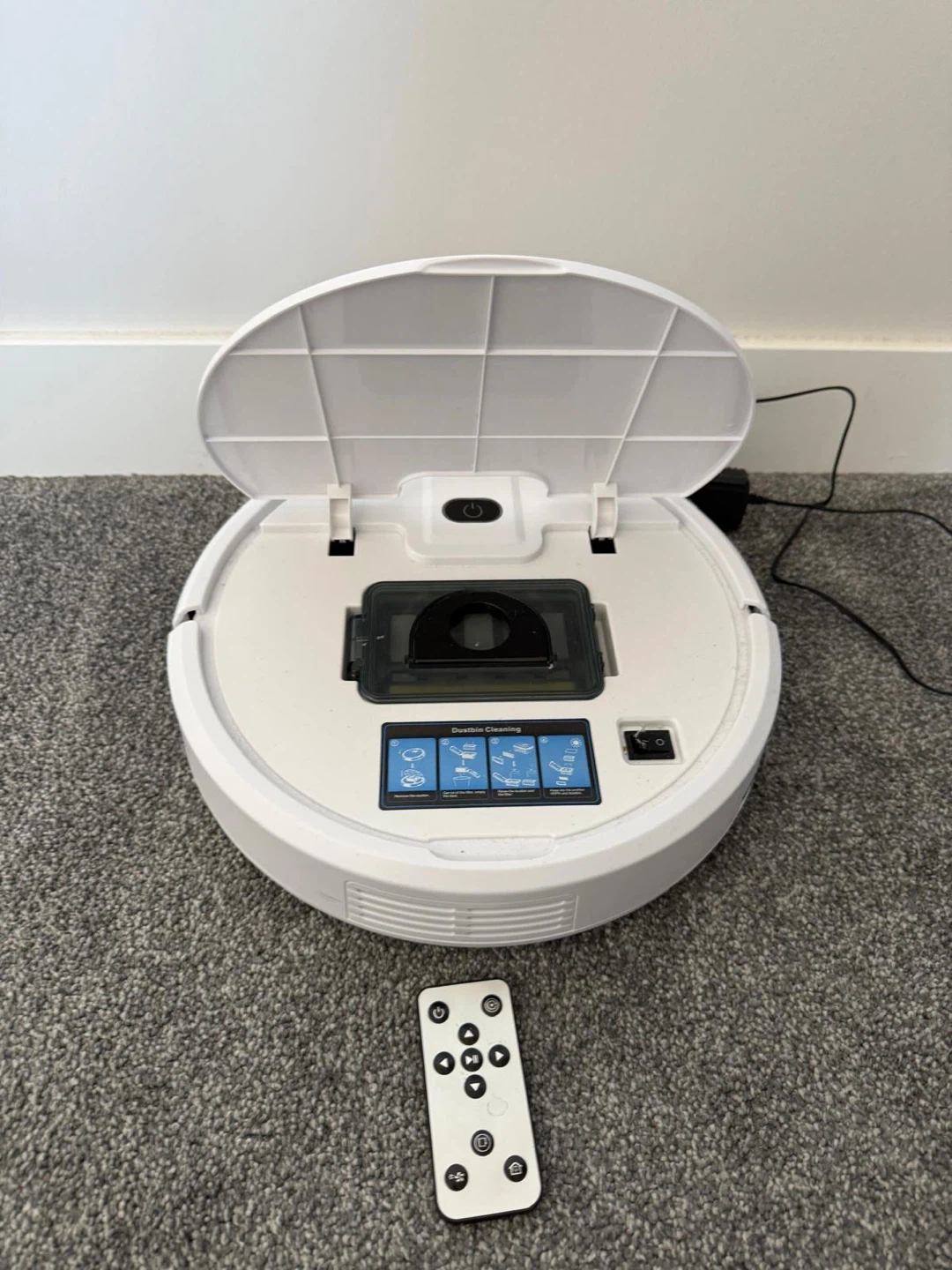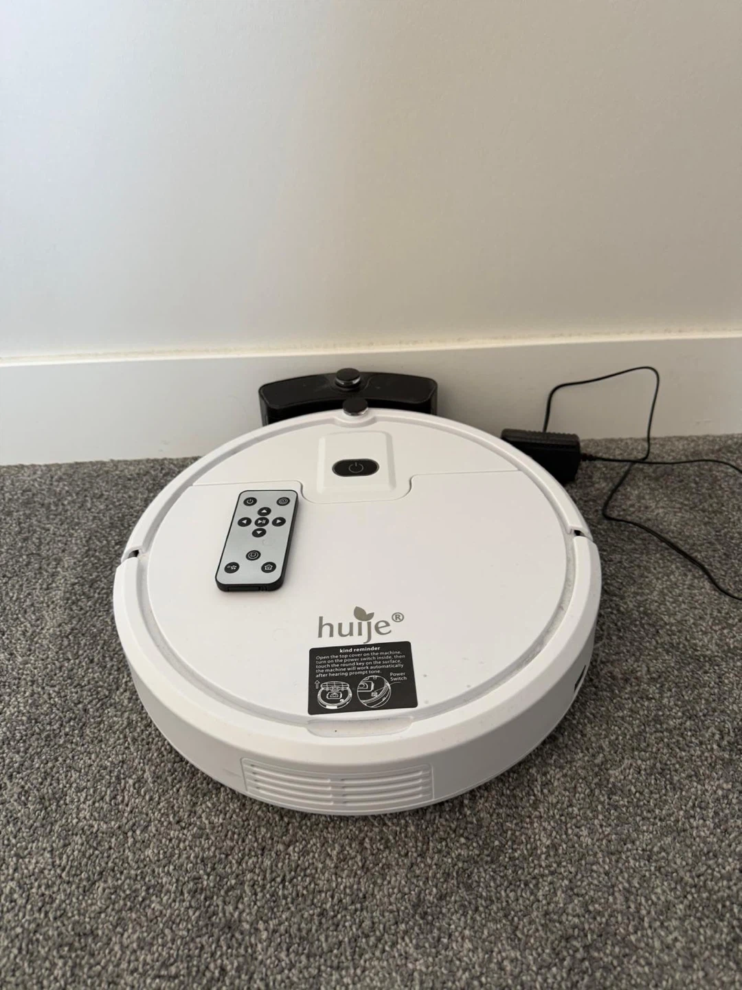 This white Huije robot vacuum cleaner comes with a remote control and charging dock. It's designed for automated floor cleaning. It features a dustbin for debris collection.