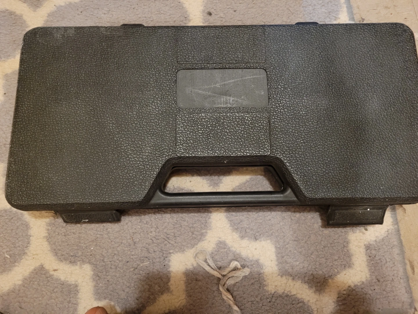 This is a socket wrench set in a black plastic case. It includes a ratchet, extension bars, and a variety of sockets. A red-handled screwdriver is also included. All pieces appear to be made of metal.