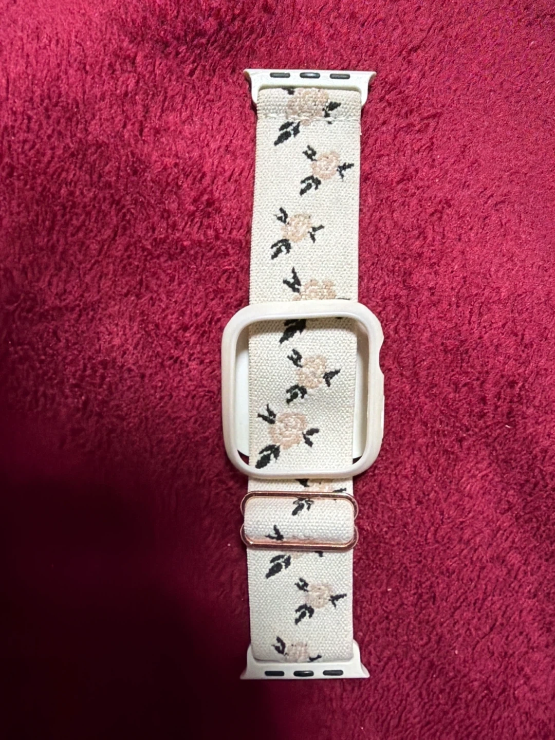 A stretchy watch band with a cute floral pattern. It fits Apple Watch and has a rose gold buckle. It's made of comfortable, durable fabric. Great for adding a touch of personal style to your watch!30mm