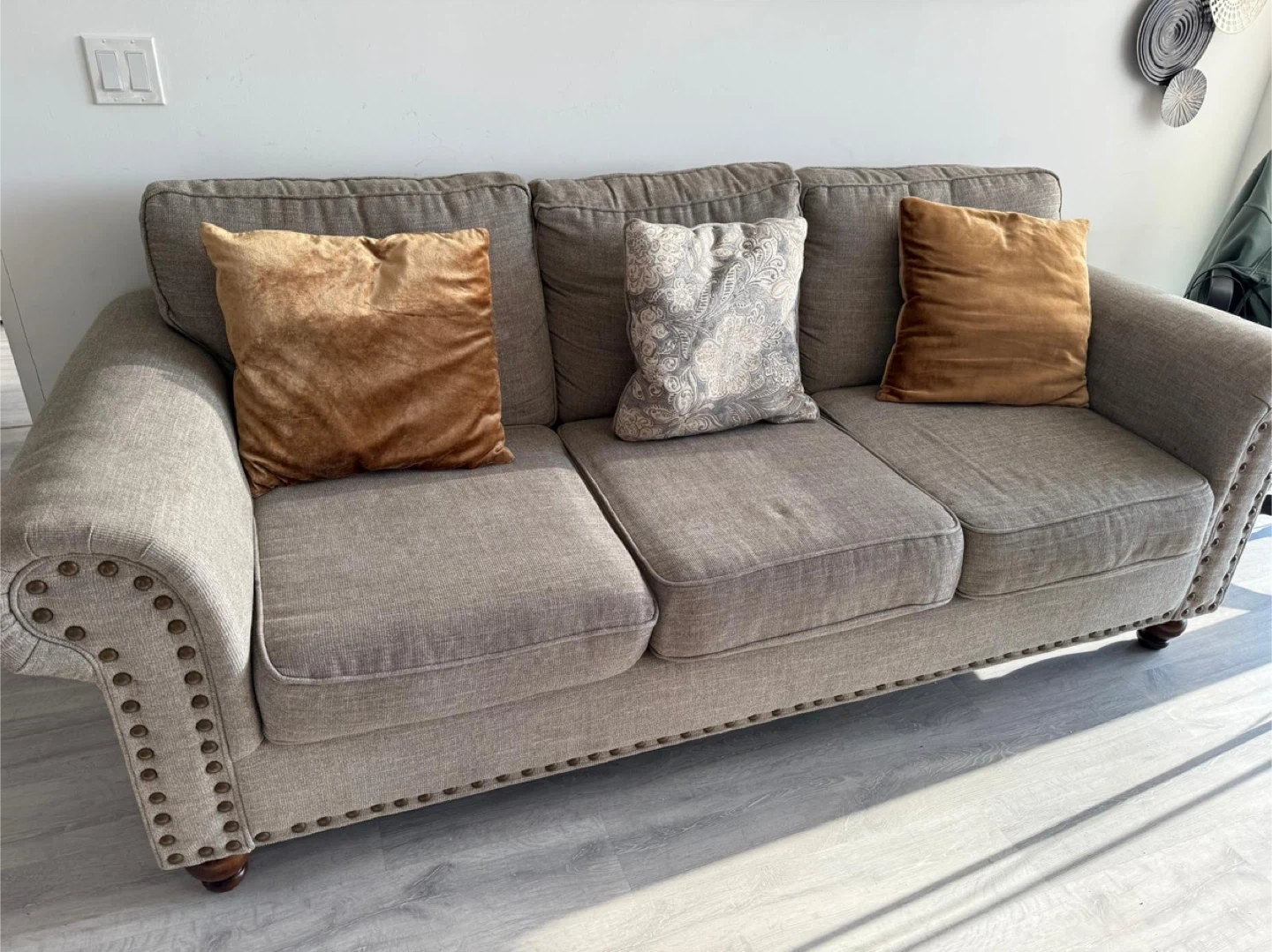 Looking to give this comfy three-seater sofa a new home! It's in great shape and perfect for lounging. The neutral colour makes it easy to match with any decor. It features three cushions and has a classic design with studded detailing on the arms. A cozy addition to any living room!