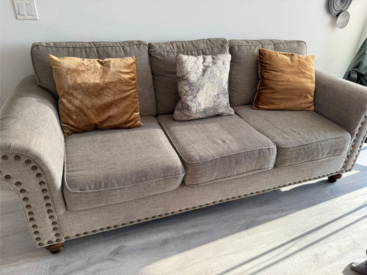 Looking to give this comfy three-seater sofa a new home! It's in great shape and perfect for lounging. The neutral colour makes it easy to match with any decor. It features three cushions and has a classic design with studded detailing on the arms. A cozy addition to any living room!
