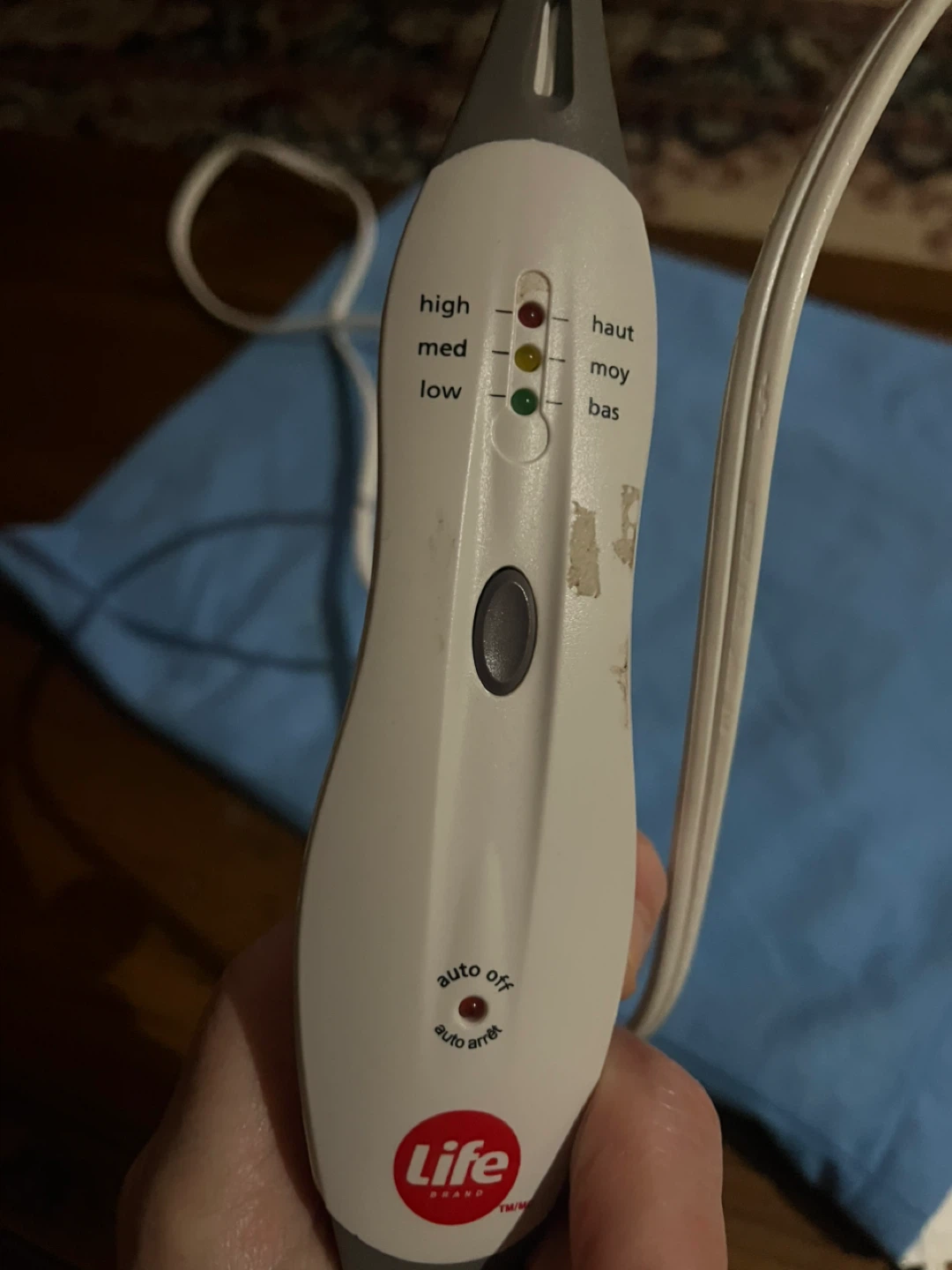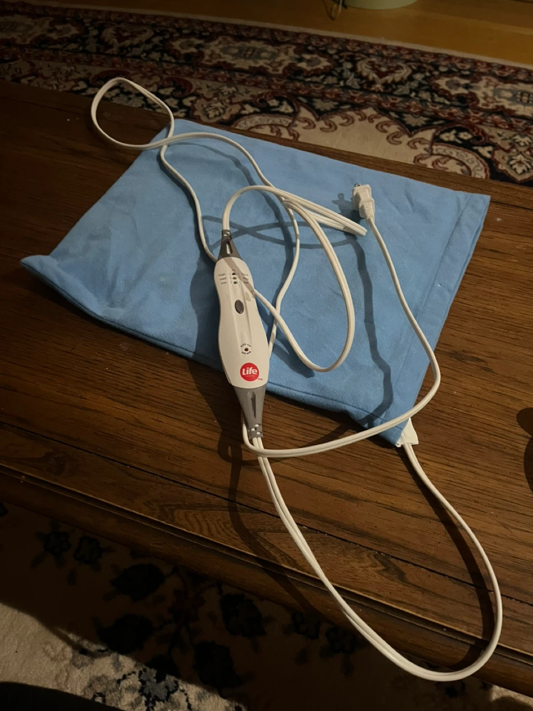 Life Brand heating pad. It has high, med, and low heat settings with an auto-off function. Has a removable blue cover that is soft and comfortable.