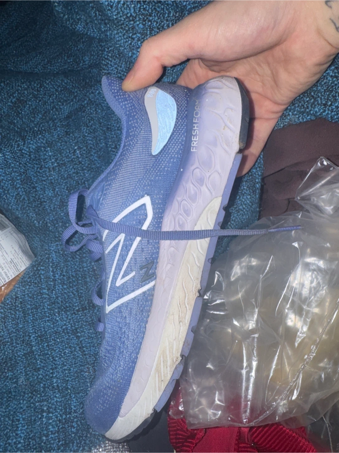 These are New Balance women's running shoes with Fresh Foam cushioning. They are purple and white with a breathable mesh upper. Great for your daily runs!