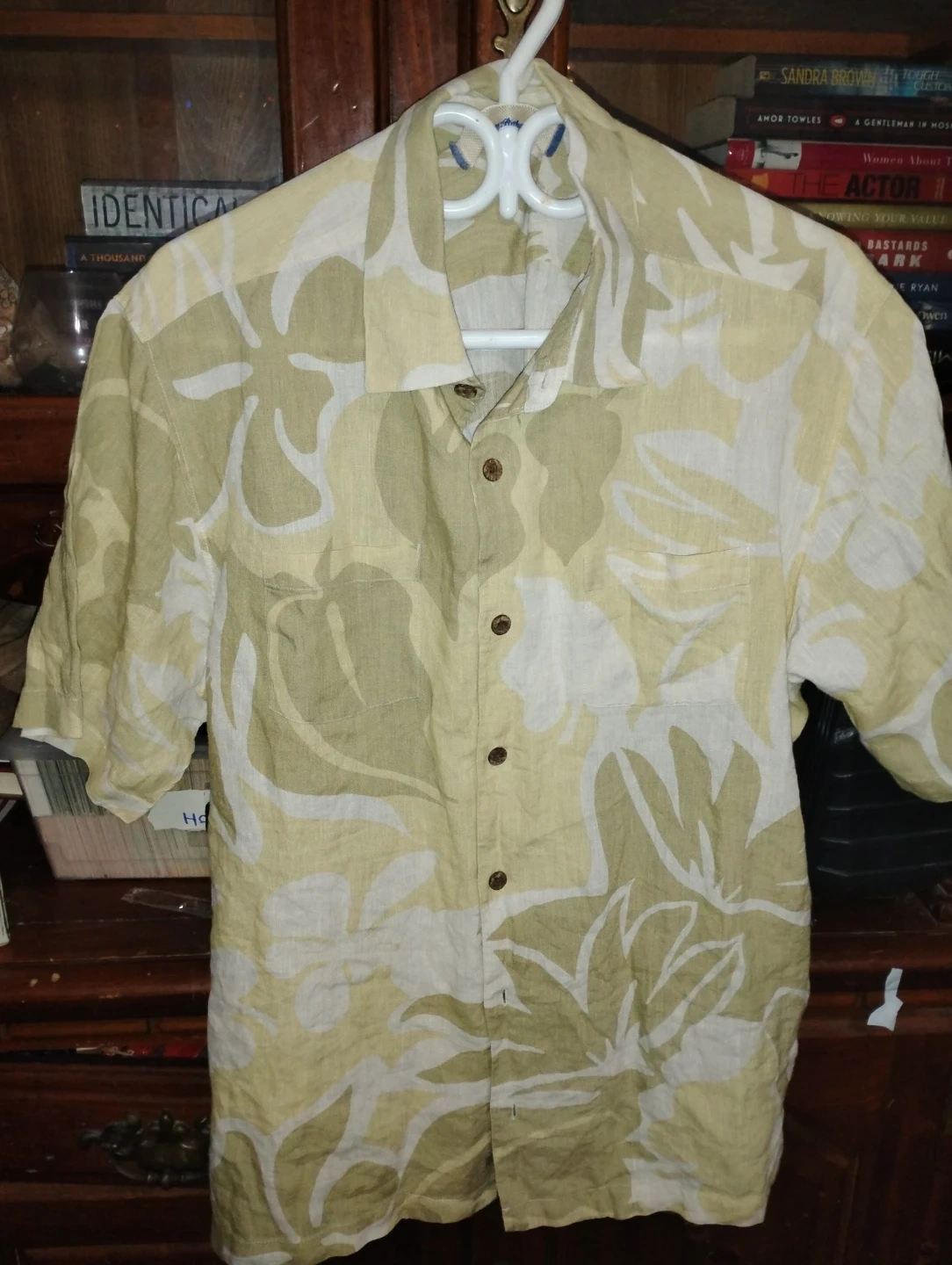 Tommy Bahama short-sleeve button-up shirt with a bold floral print. Features a single chest pocket and a comfortable fit. Great for casual wear or tropical vacations!