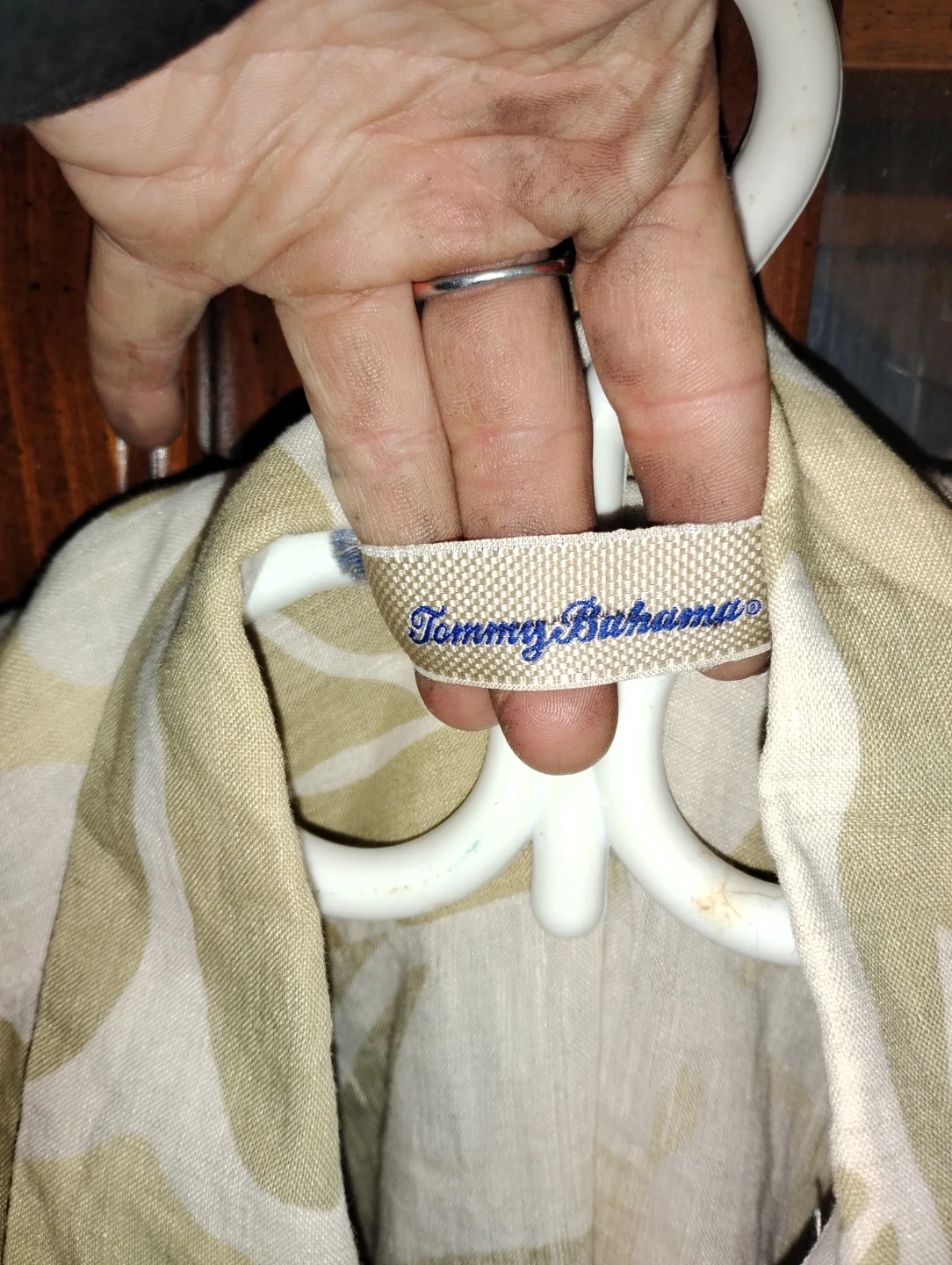 Tommy Bahama short-sleeve button-up shirt with a bold floral print. Features a single chest pocket and a comfortable fit. Great for casual wear or tropical vacations!