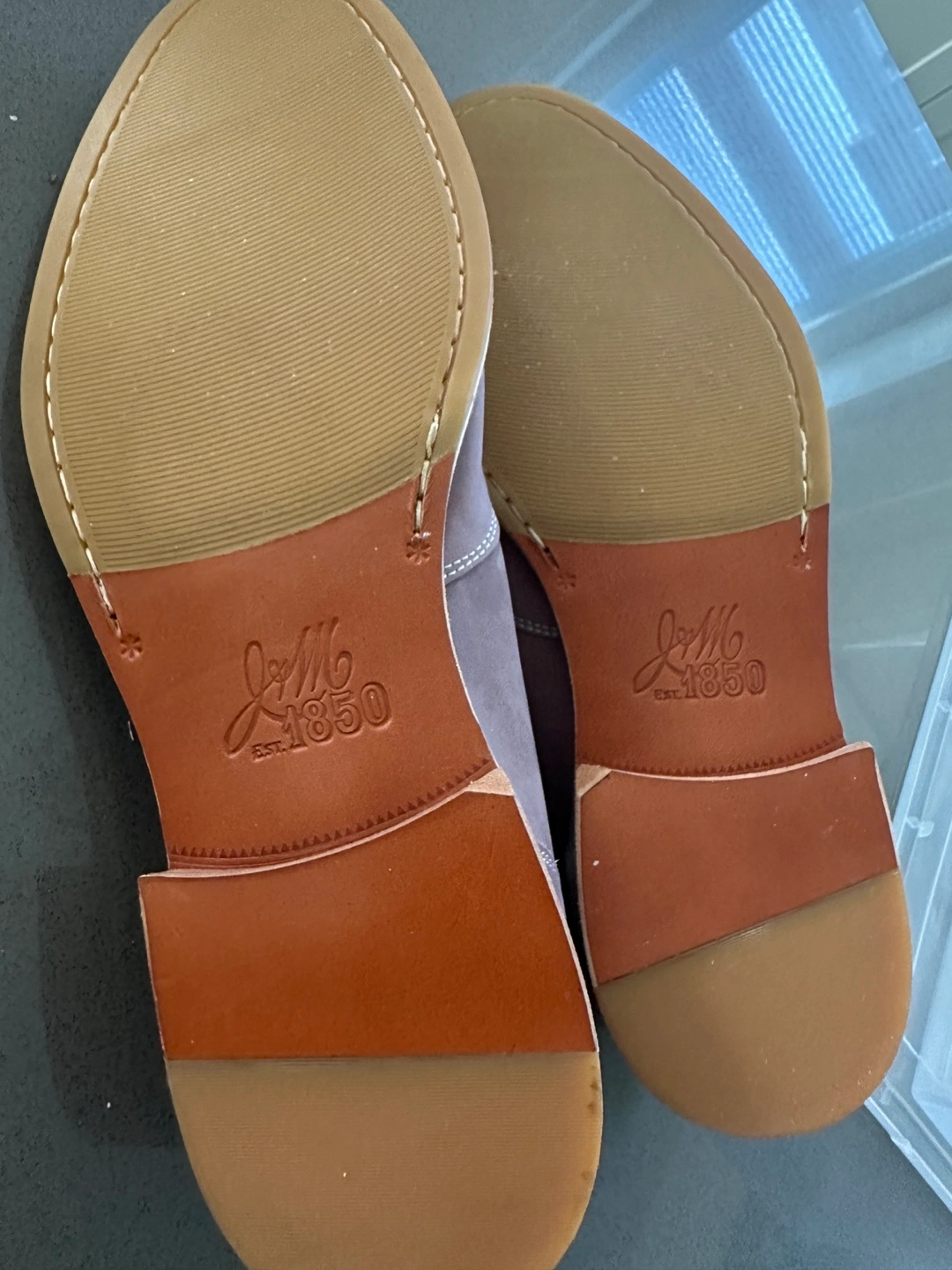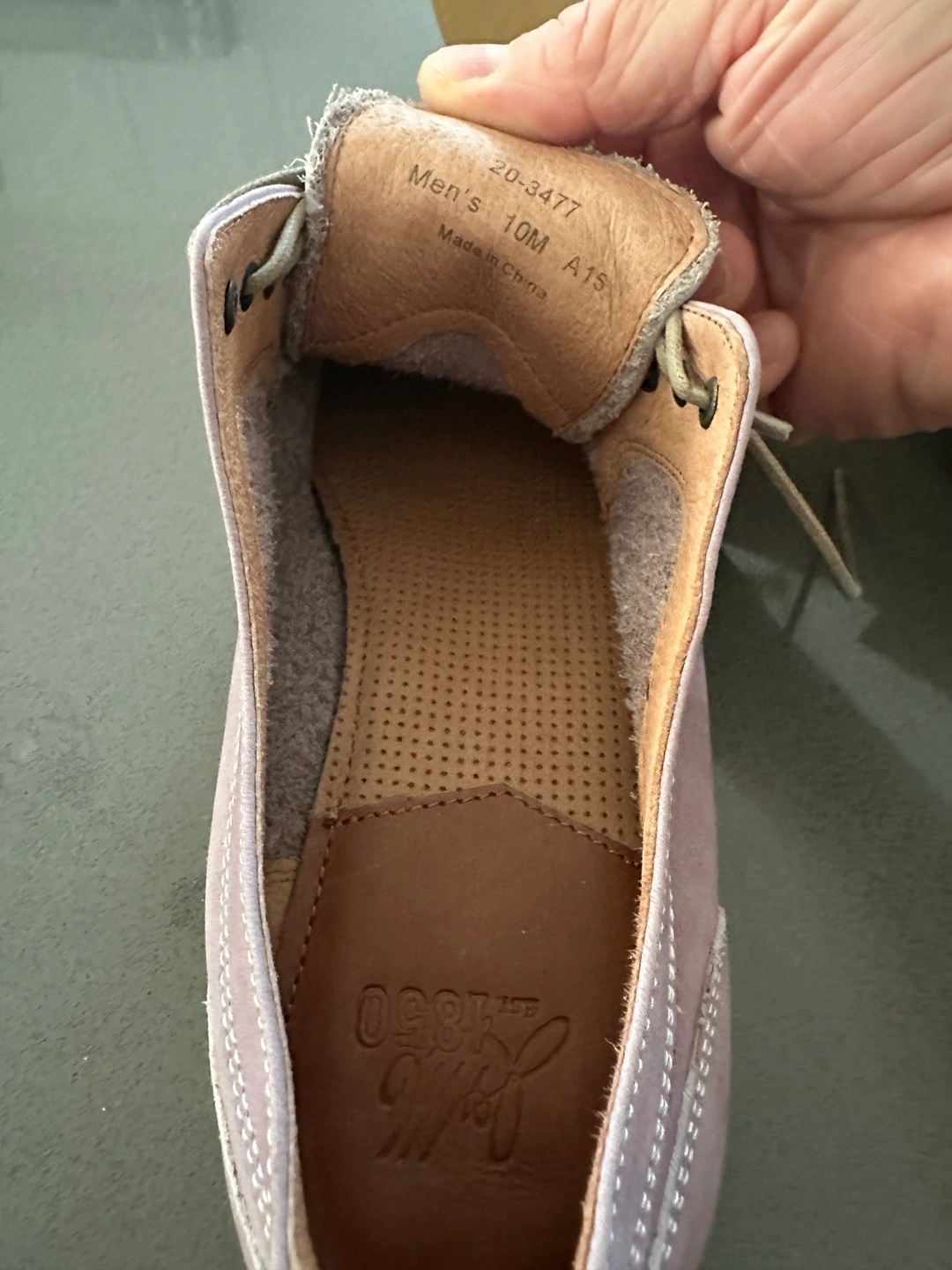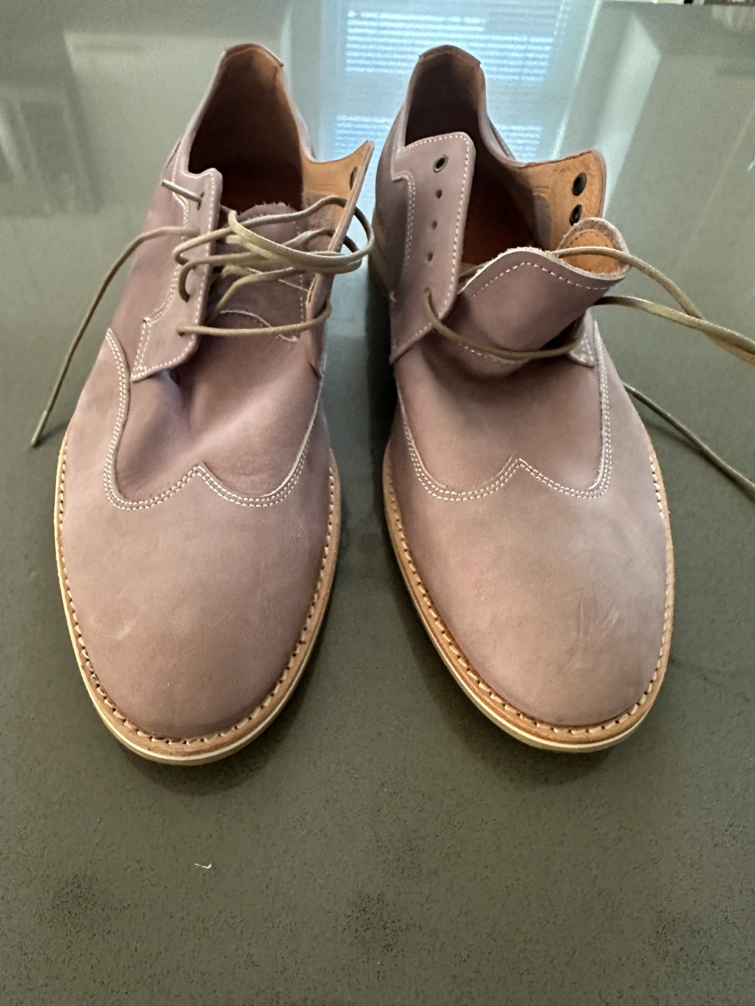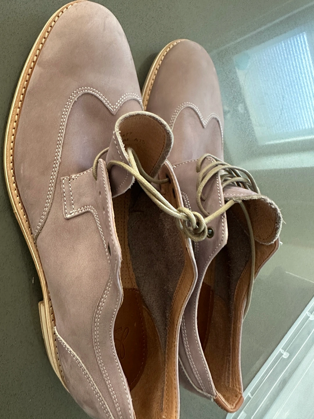 Pair of men's leather wingtip shoes. Size 10M. Light purple colour. Leather soles and laces.