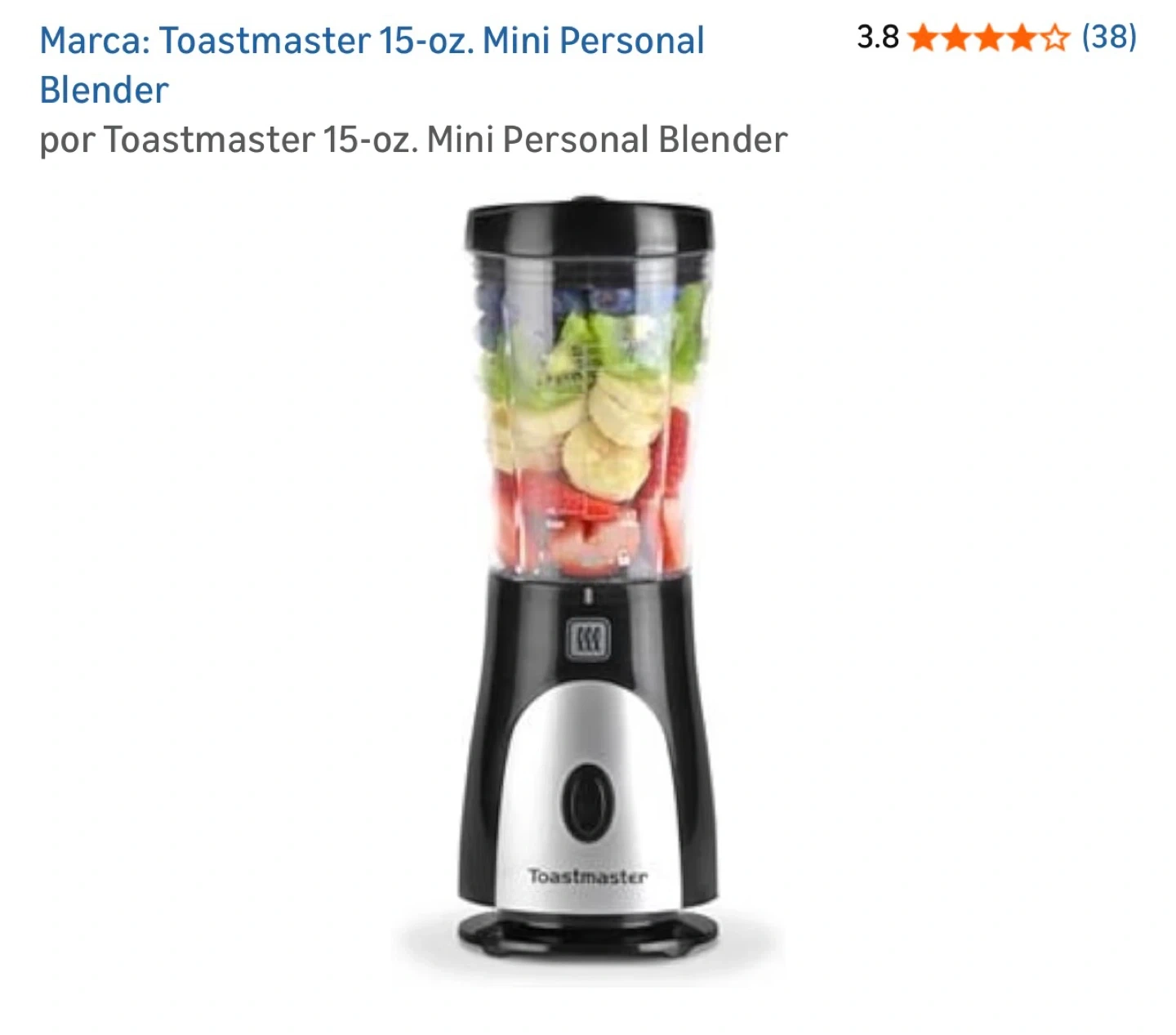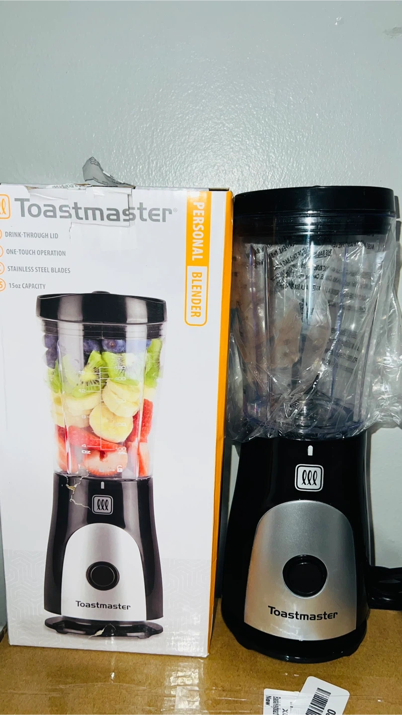Toastmaster personal blender with a 15oz capacity. Features a drink-through lid and one-touch operation. Stainless steel blades.