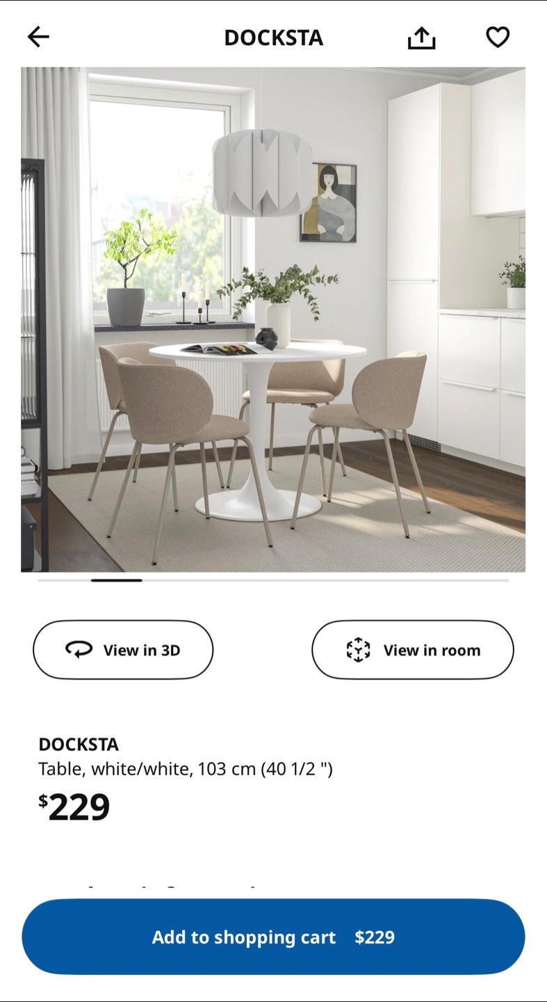 It's a white DOCKSTA round dining table from IKEA. The tabletop is 103 cm (40 1/2 ") in diameter. It's a stylish tulip-style base that fits well in smaller dining areas.