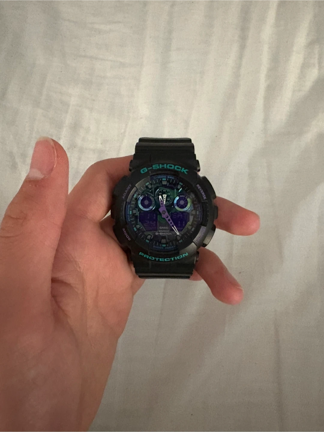 This is a Casio G-Shock GA-100 watch with a black and purple colour scheme. It features shock resistance and anti-magnetic properties. Its durable construction makes it suitable for active lifestyles.