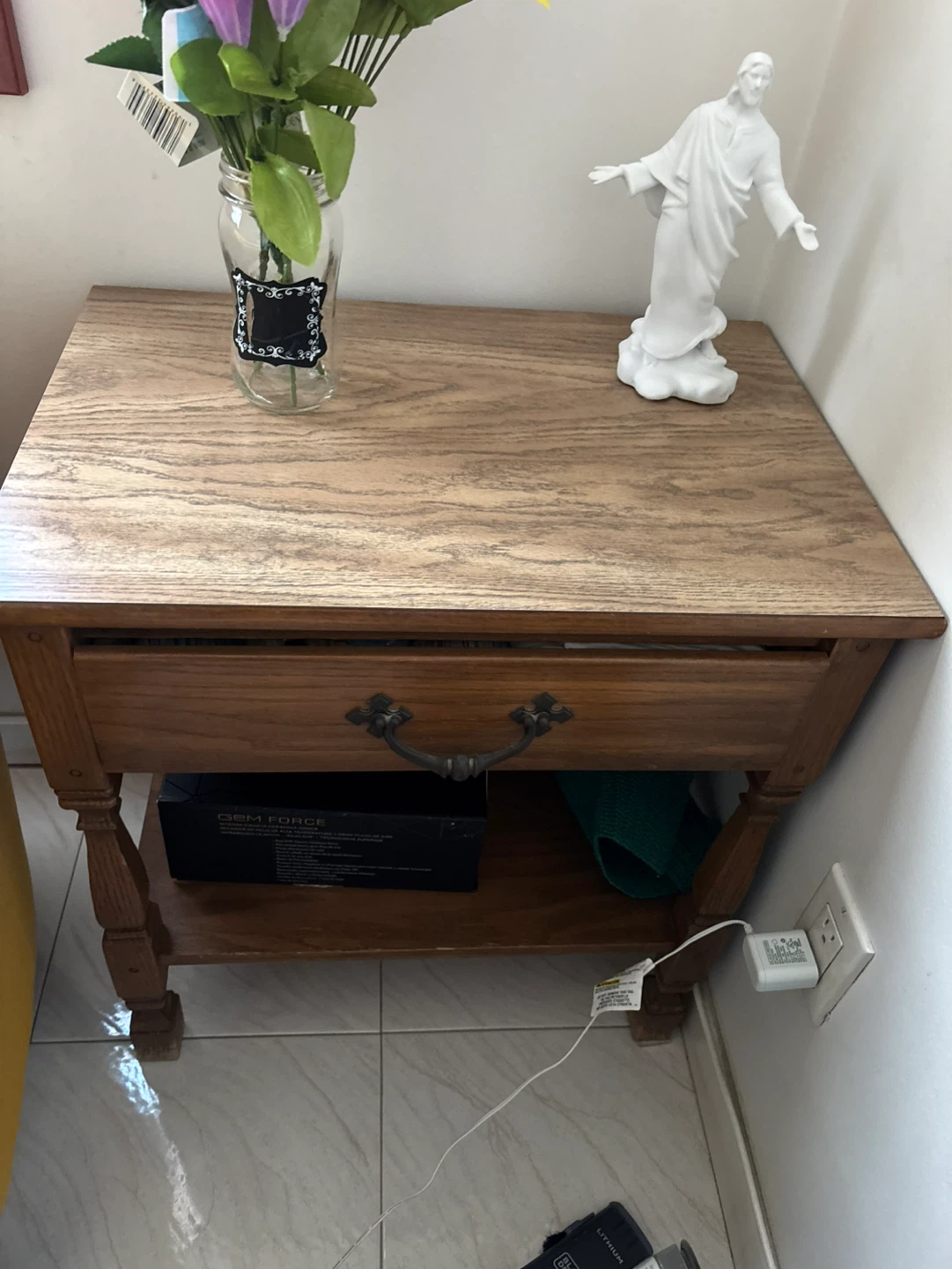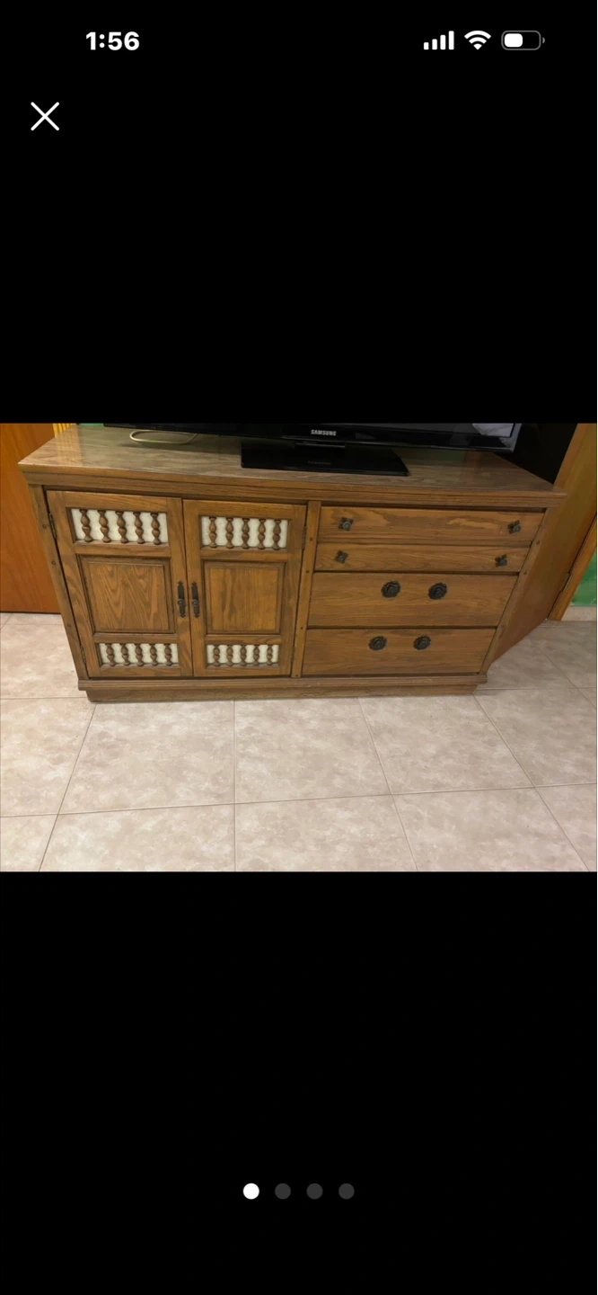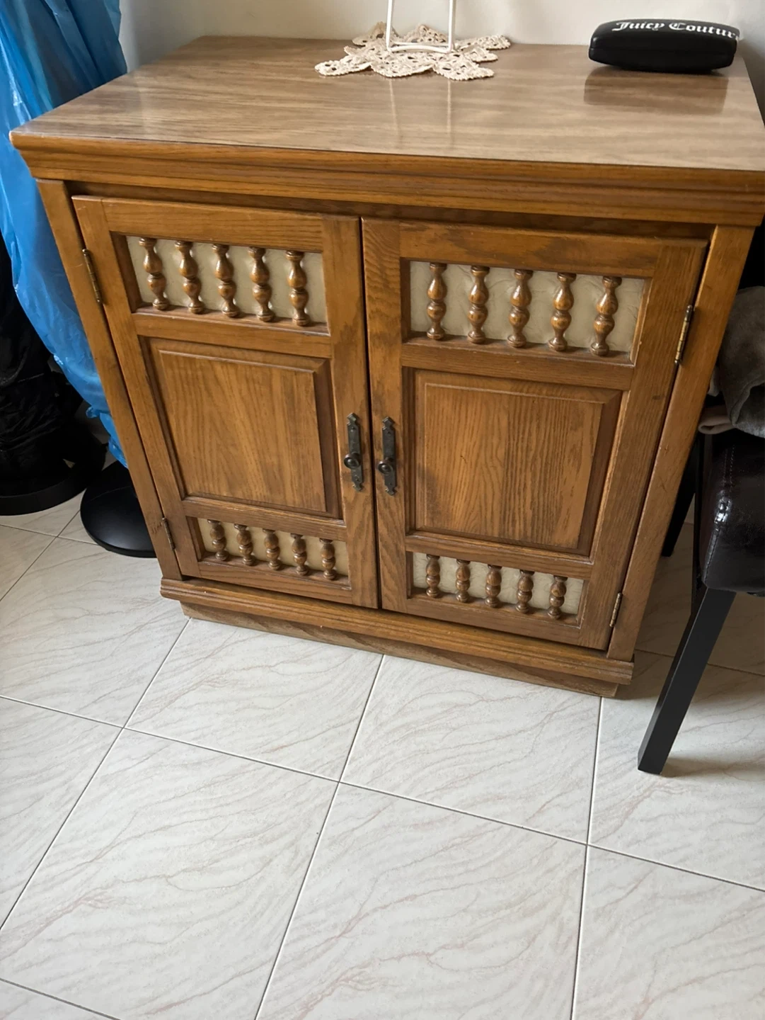 A charming wooden cabinet featuring two doors and a drawer. It's perfect for storage or as a TV stand. The distressed wood finish adds a rustic touch.1970s set of three
