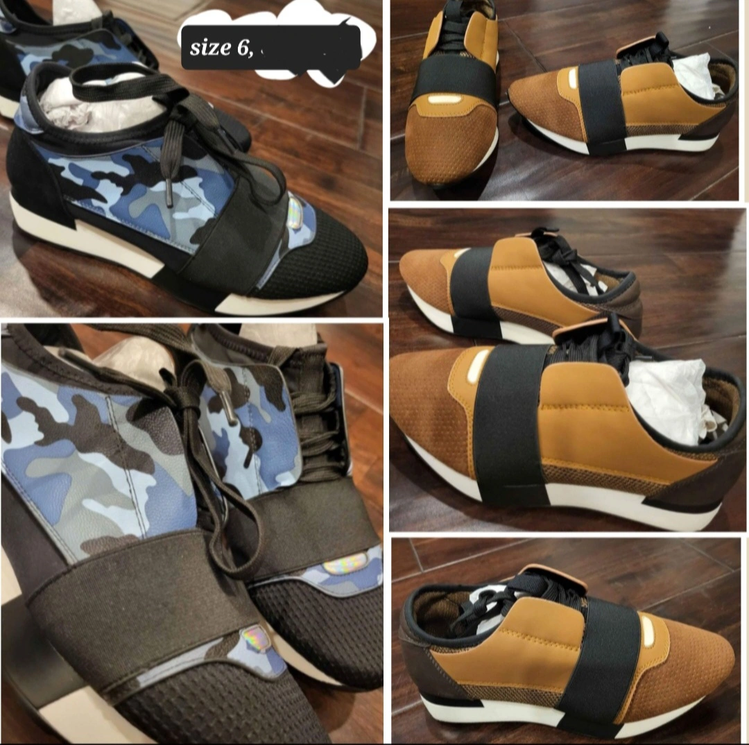 2 Pairs of low-top sneakers. Size 6. One pair features a blue camouflage print, the other is tan/brown. Lace-up closure. Classic runner style. Both brand new. $15 each.