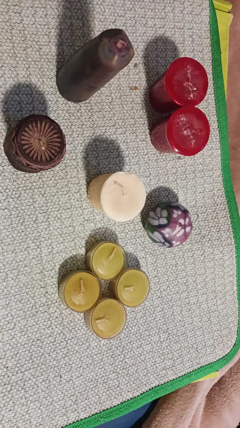 A collection of small decorative candles for ambiance. Perfect for creating a cozy atmosphere or for decorative accents. Adds a warm touch to any space!