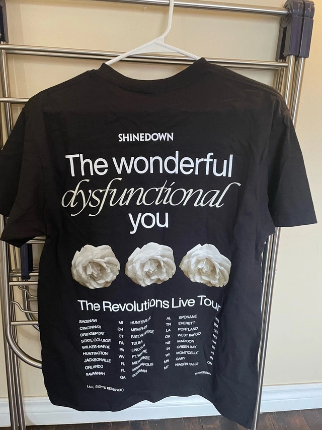 Rock out in style with this Shinedown "The Wonderful Dysfunctional You" tour T-shirt! This is a used band tee, perfect for any fan looking to show off their love for the music. Key Features: - Band: Shinedown - Tour: The Revolutions Live Tour - Design: Features a unique graphic with roses and tour dates If the ad's still up, it's ready to go to a new home!