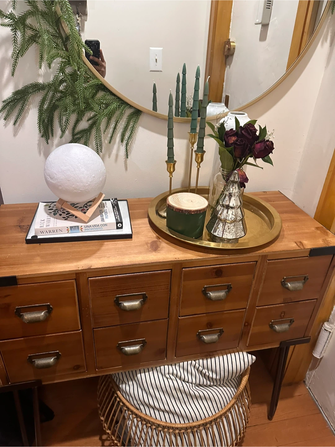 Here's a charming wooden console table that would look great in an entryway or living room. It features multiple drawers for storage. The table has a warm, natural wood finish and unique drawer pulls. It's a stylish and functional piece!