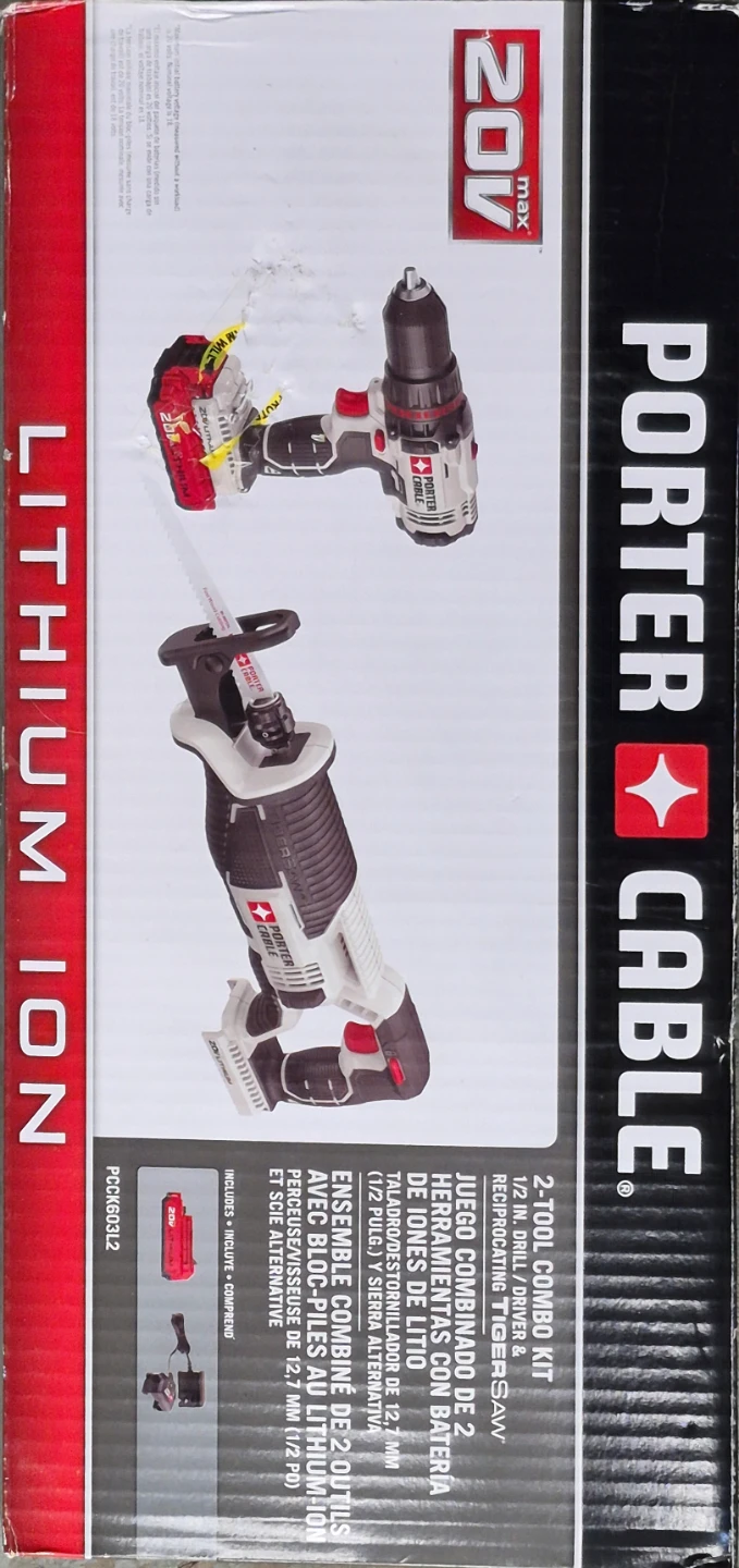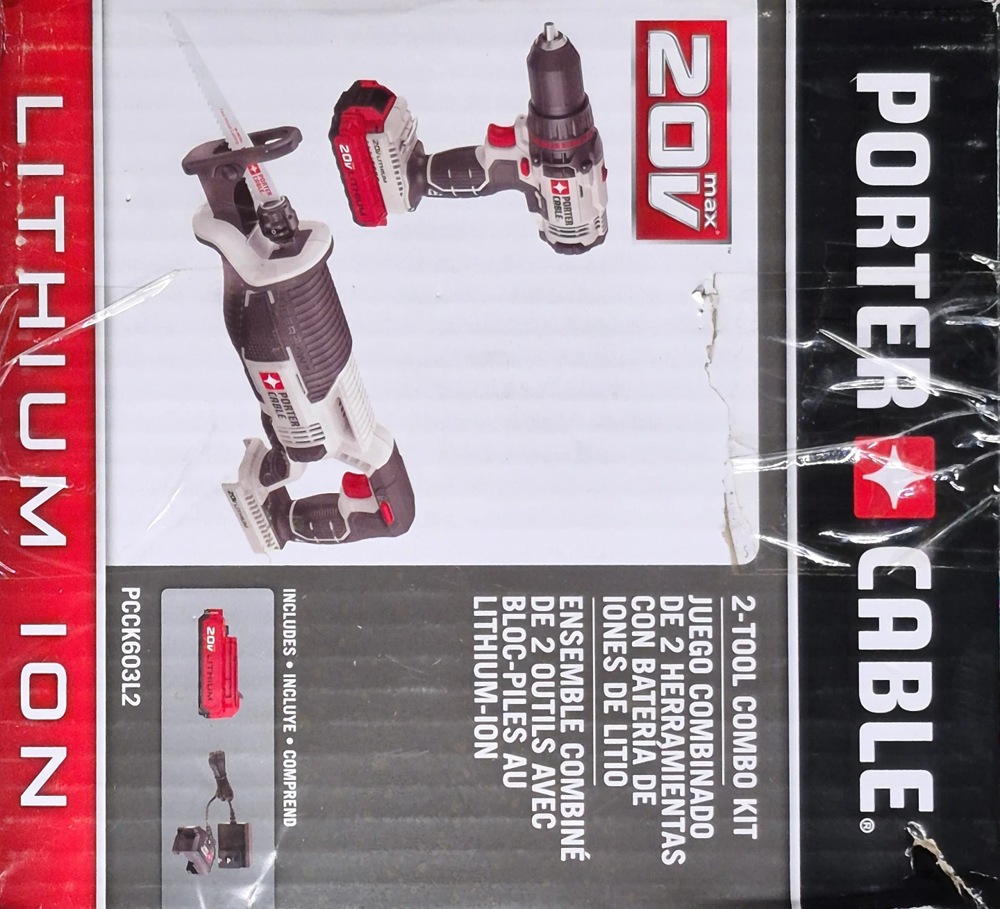 This Porter Cable 2-Tool Combo Kit includes a 20V MAX drill and a reciprocating saw. It runs on lithium-ion battery power. Includes battery and charger.