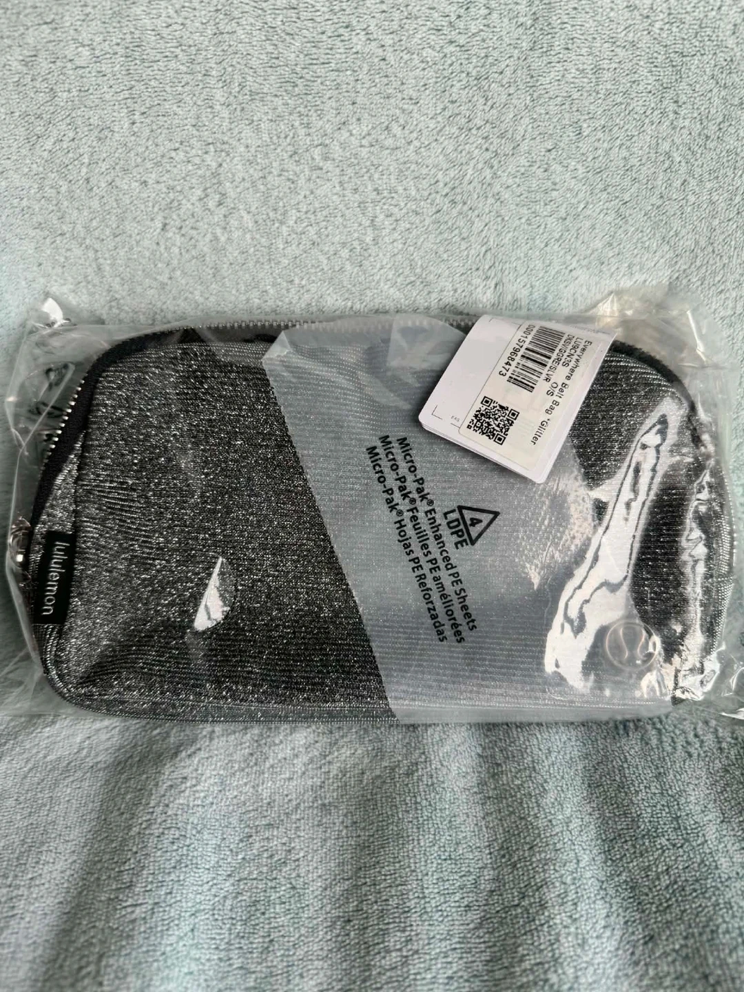 This Lululemon Everywhere Belt Bag comes in a shimmering glitter fabric. It's perfect for carrying your phone, keys, and wallet. The adjustable strap makes it easy to wear crossbody or around your waist.