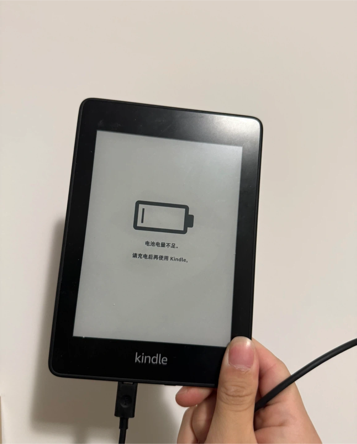 This is a black Amazon Kindle e-reader. It's currently showing a low battery warning. It's a great device for reading digital books.