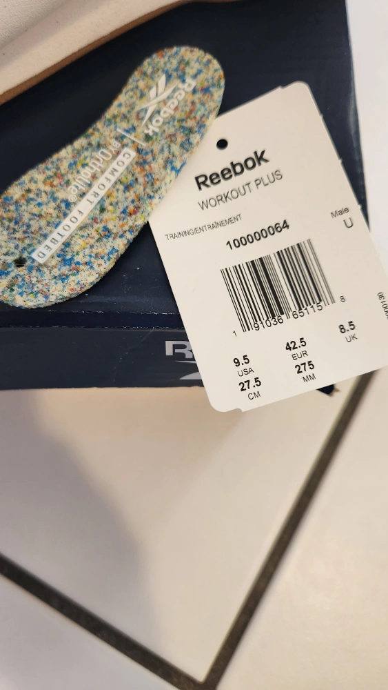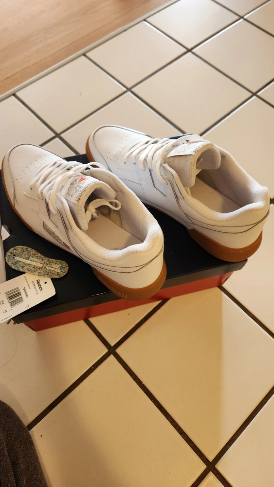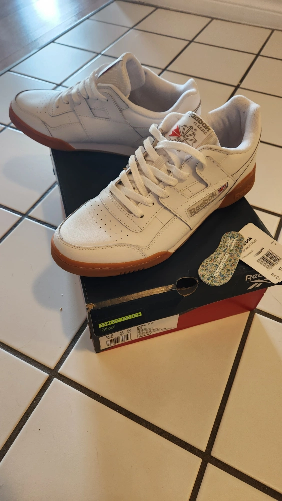 Classic Reebok Workout Plus sneakers. White leather upper, gum sole. Men's size 9.5 US. (New in box)