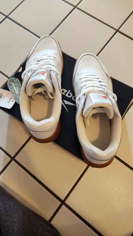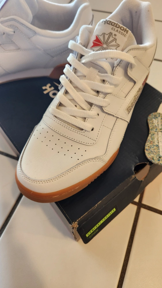 Classic Reebok Workout Plus sneakers. White leather upper, gum sole. Men's size 9.5 US. (New in box)