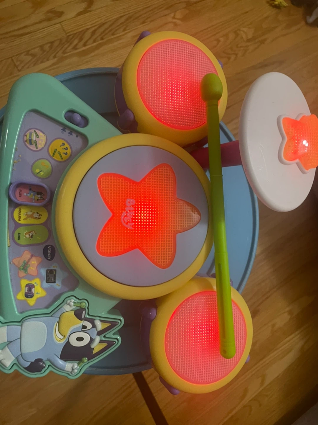 Check out this VTech Bluey's Sing & Discover Drum Set! It's perfect for little ones who love music and Bluey. It's in great shape and ready for a new musician to enjoy!