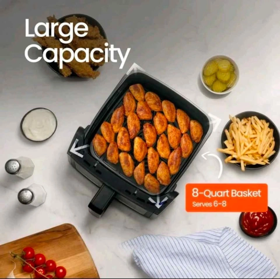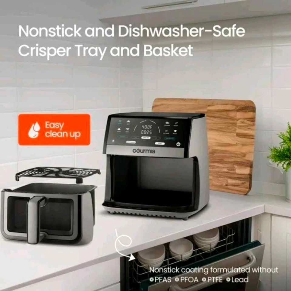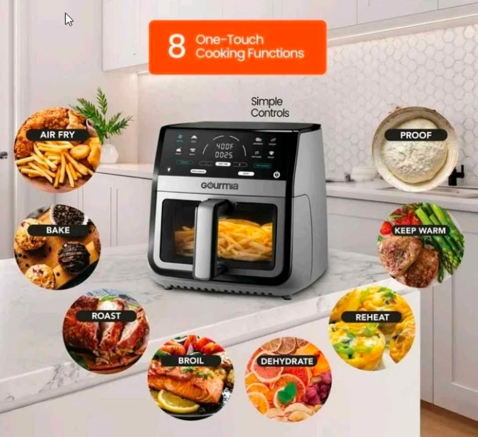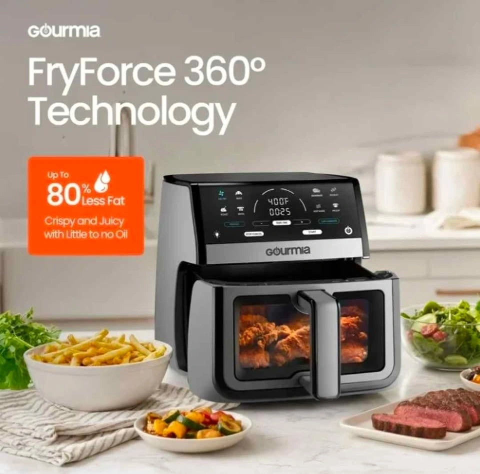 Open Box Gourmia 8-quart digital air fryer designed for fast, efficient, and healthier cooking with little to no oil. This large-capacity air fryer features a built-in viewing window and multiple preset cooking functions, making it easy to prepare meals for families or gatherings. Rapid hot-air circulation technology delivers evenly cooked, crispy results across a wide variety of foods.