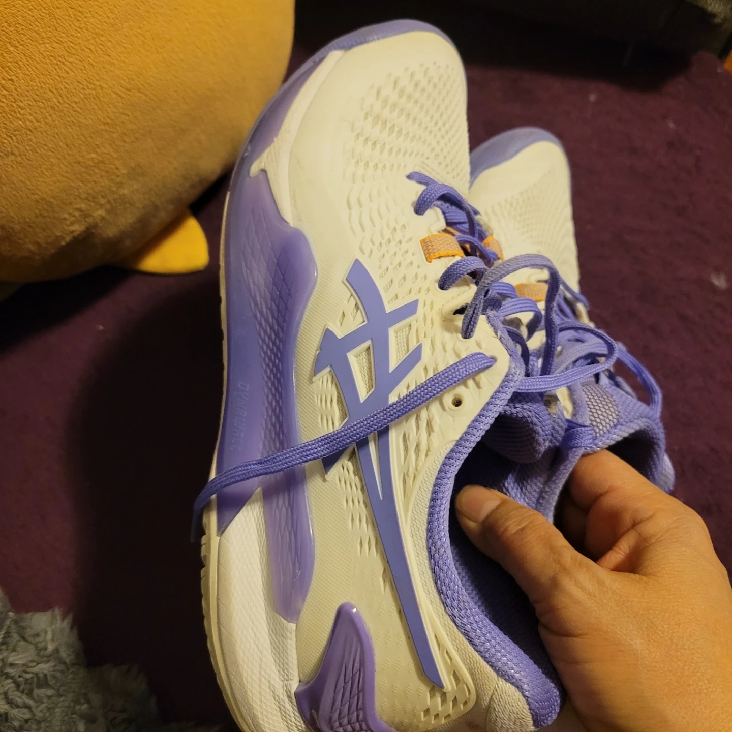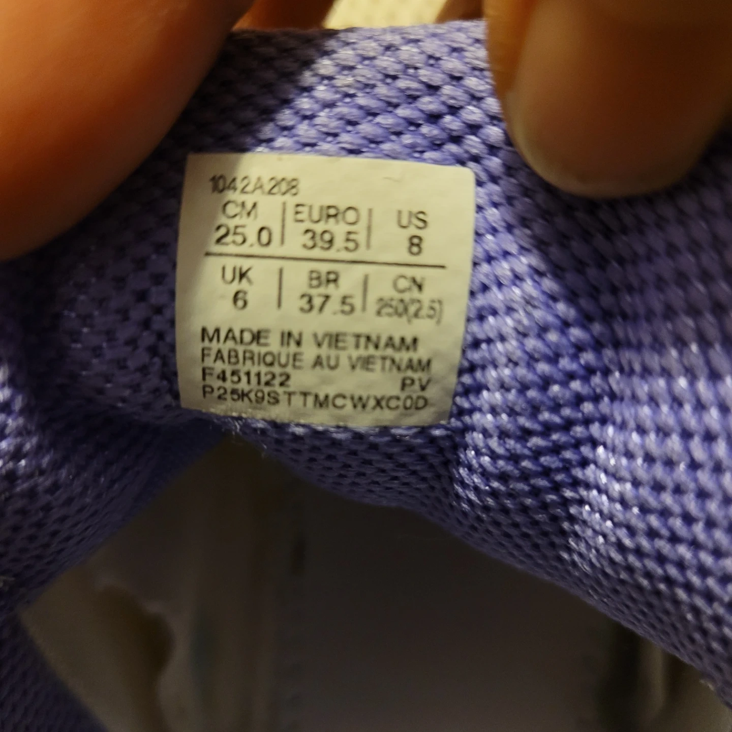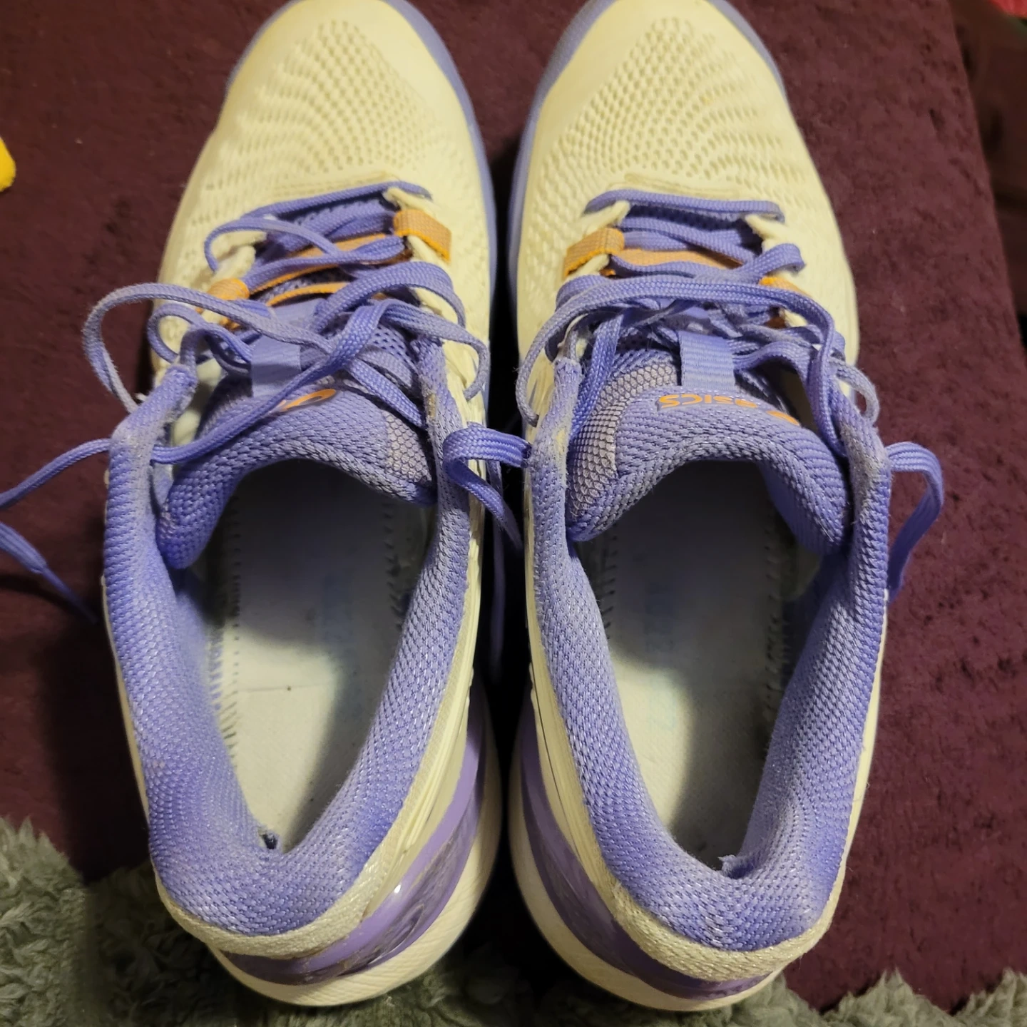 These Asics Revolution tennis shoes are a size 8 US (39.5 EUR). They're white with purple and orange accents. Made in Vietnam. No insoles (can use your own - more hygenic)