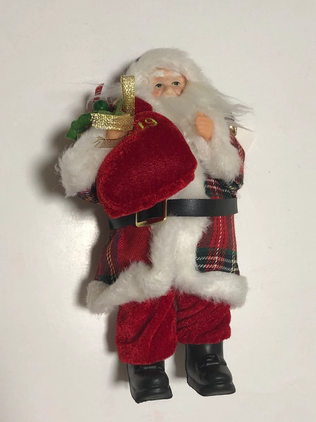 A cute Santa decoration with a plaid hat and red bag! The Santa is wearing a red and green plaid outfit with white faux fur trim. Perfect for adding a touch of Christmas cheer to your home