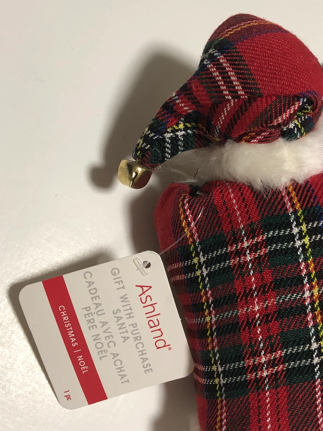 A cute Santa decoration with a plaid hat and red bag! The Santa is wearing a red and green plaid outfit with white faux fur trim. Perfect for adding a touch of Christmas cheer to your home