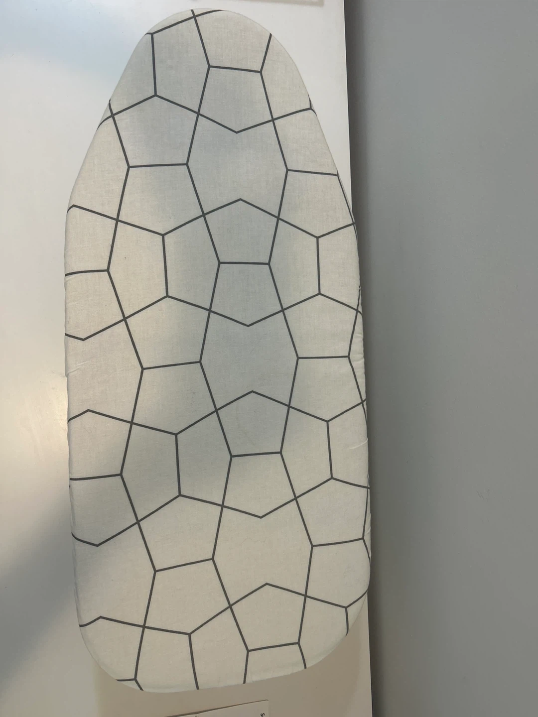 This compact tabletop ironing board is perfect for quick touch-ups and small spaces. It's designed with a sturdy metal frame and a removable, washable cover featuring a modern geometric pattern. Folds flat for easy storage!