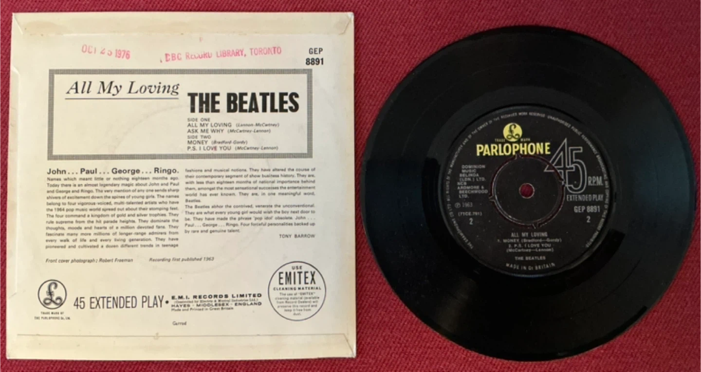 This is a 1976 issue of 1963 Parlophone 7-inch vinyl record featuring The Beatles' "All My Loving". It's an extended play record with 4 tracks: All My Loving, Ask Me Why, P.S. I Love You and Money. The record was made in Great Britain. From the pristine CBC library