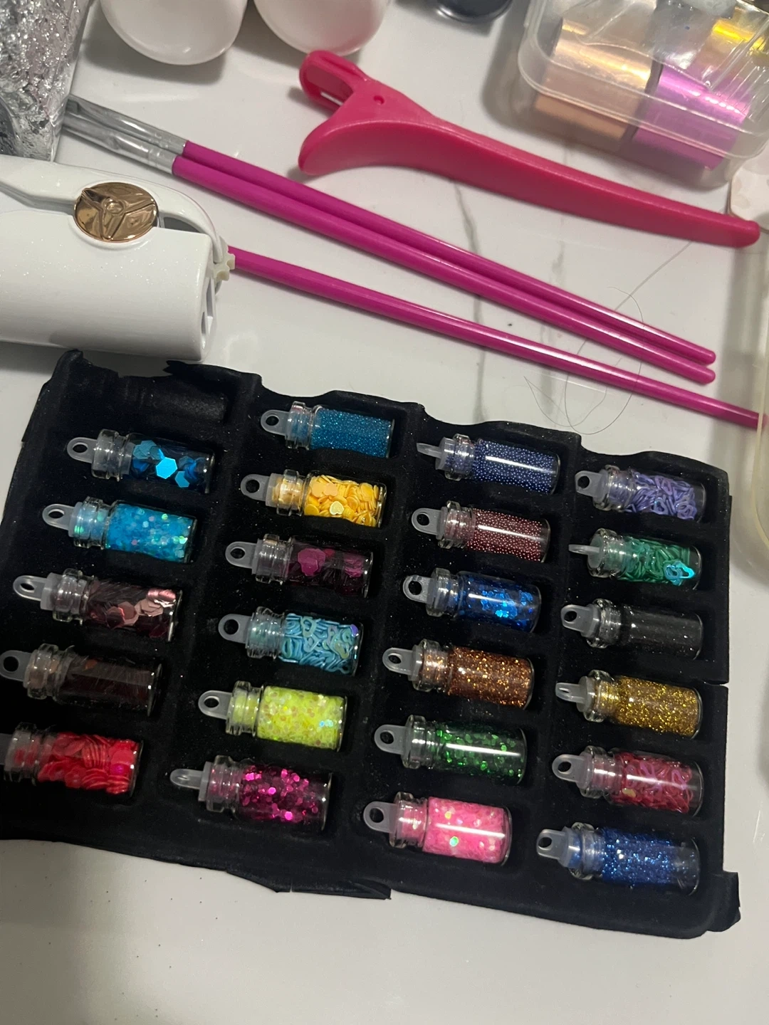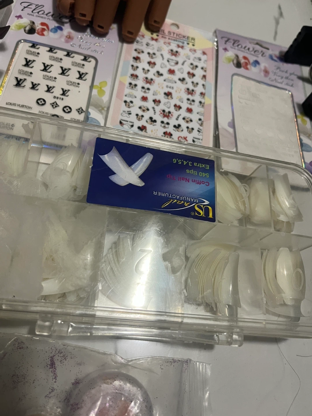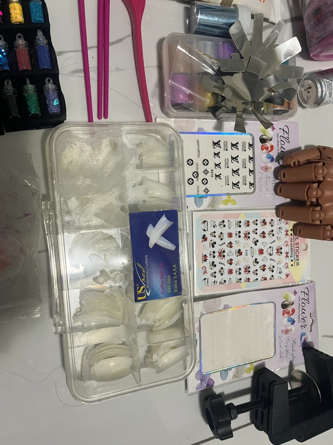 Various nail art supplies including glitters, nail tips, stickers, and tools. Includes a white nail drill, brushes, and a practice hand. Great for DIY nail enthusiasts!
