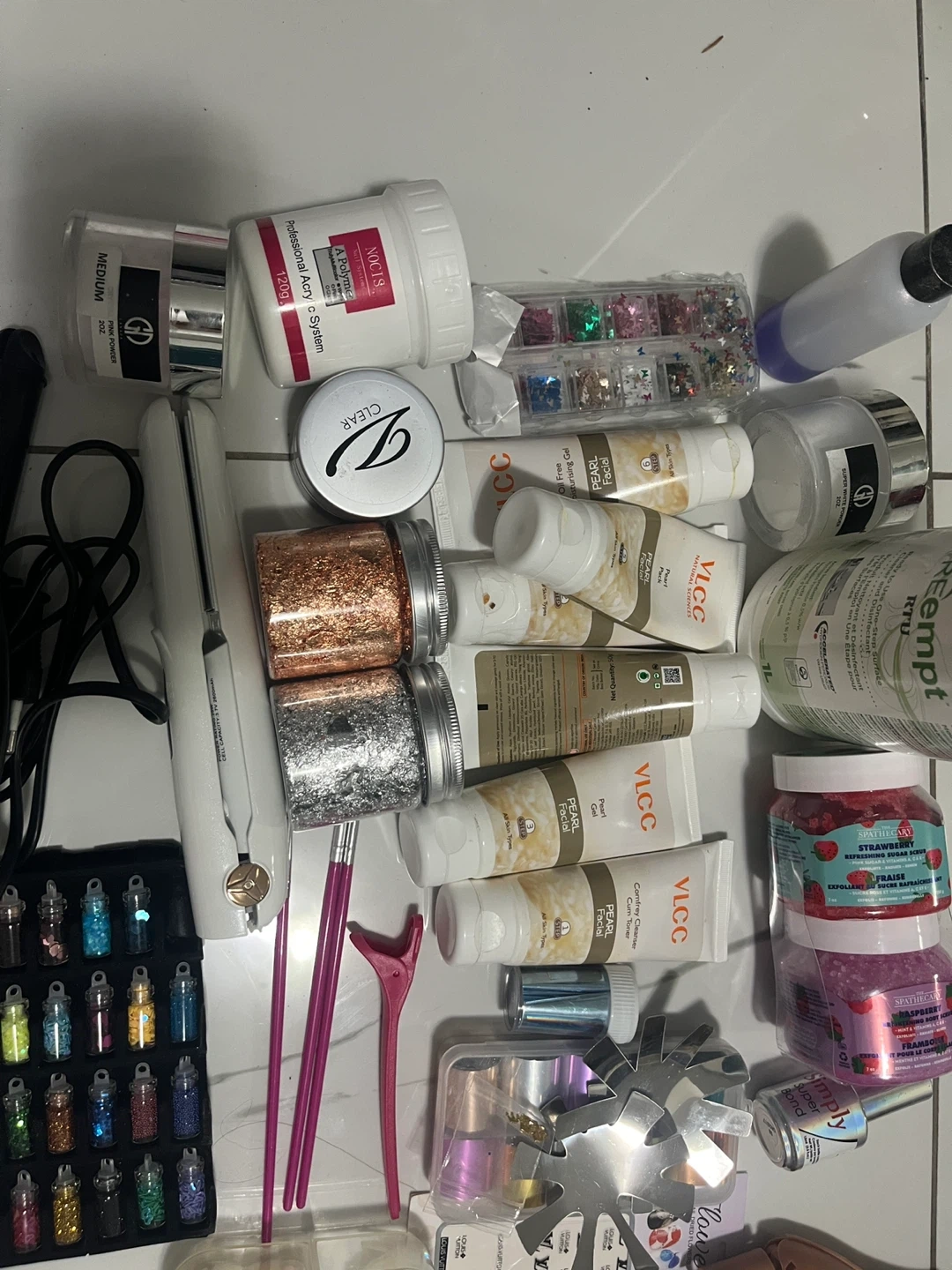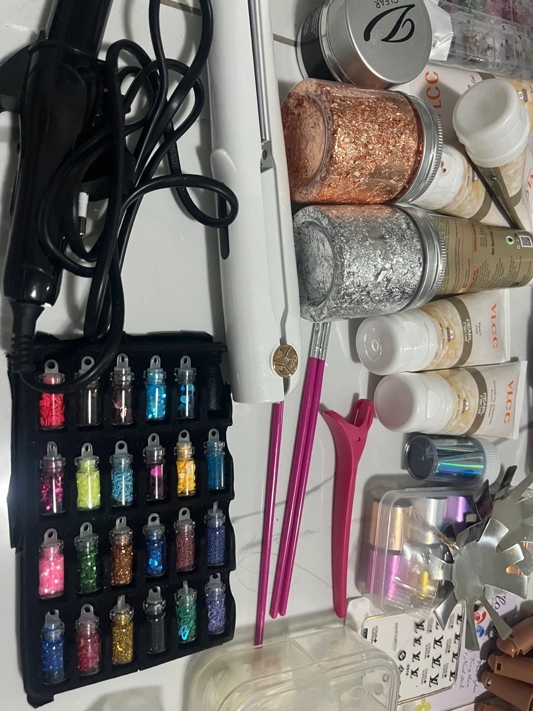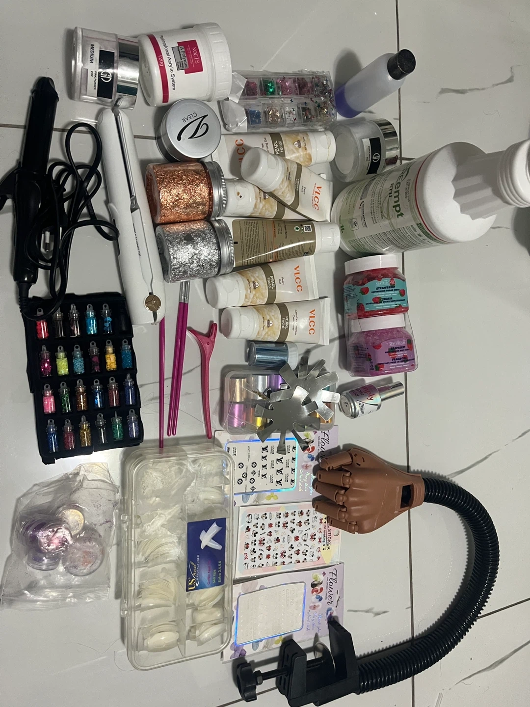 Various nail art supplies including glitters, nail tips, stickers, and tools. Includes a white nail drill, brushes, and a practice hand. Great for DIY nail enthusiasts!