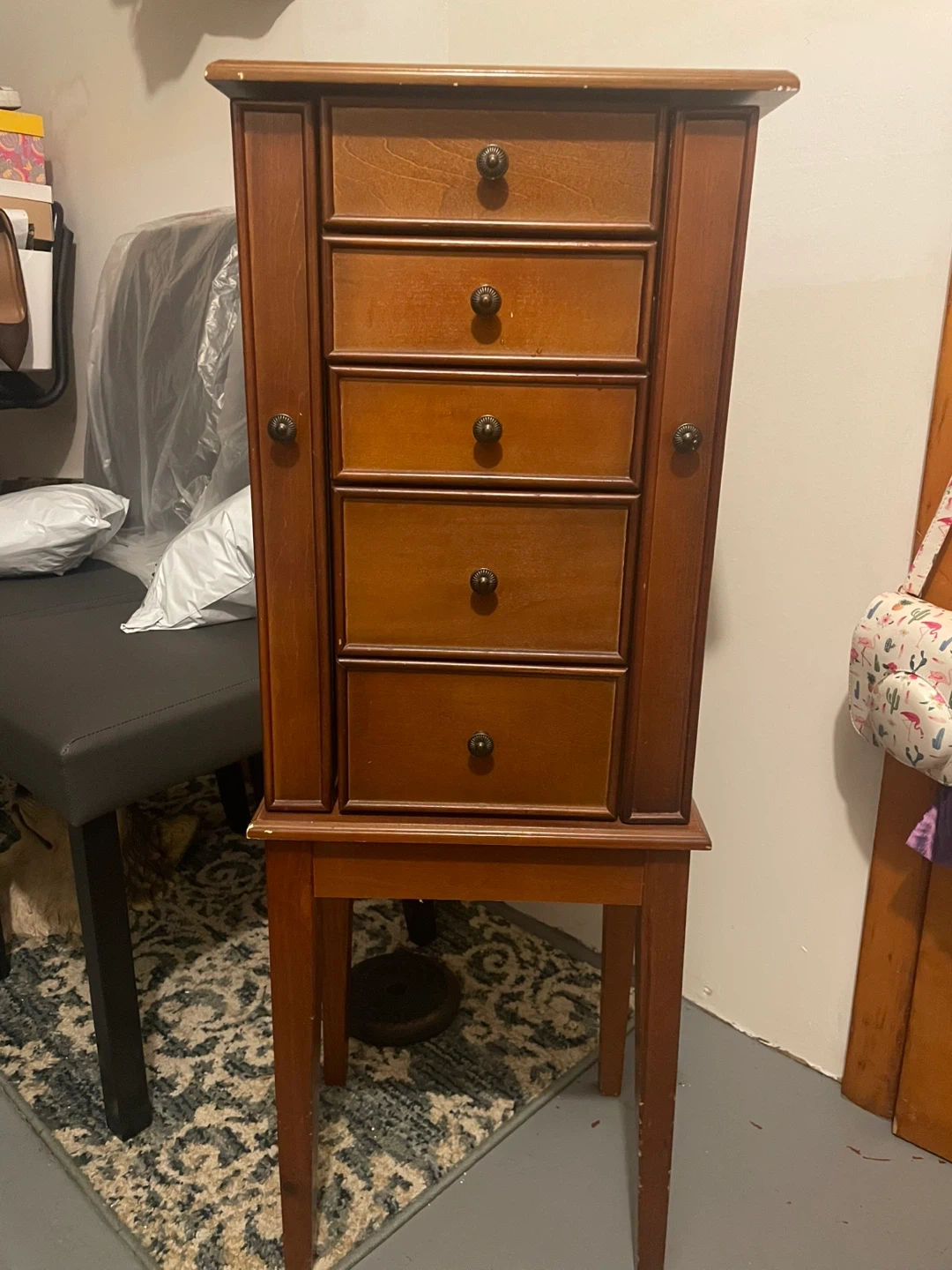 Selling a jewelry armoire in good condition. It's a brown wood color and features multiple drawers for storage. The sides open up with hooks for necklaces. Perfect for keeping your jewelry organized! Please come pick it up asap I have no space again my husband can deliver but that will be a fee !