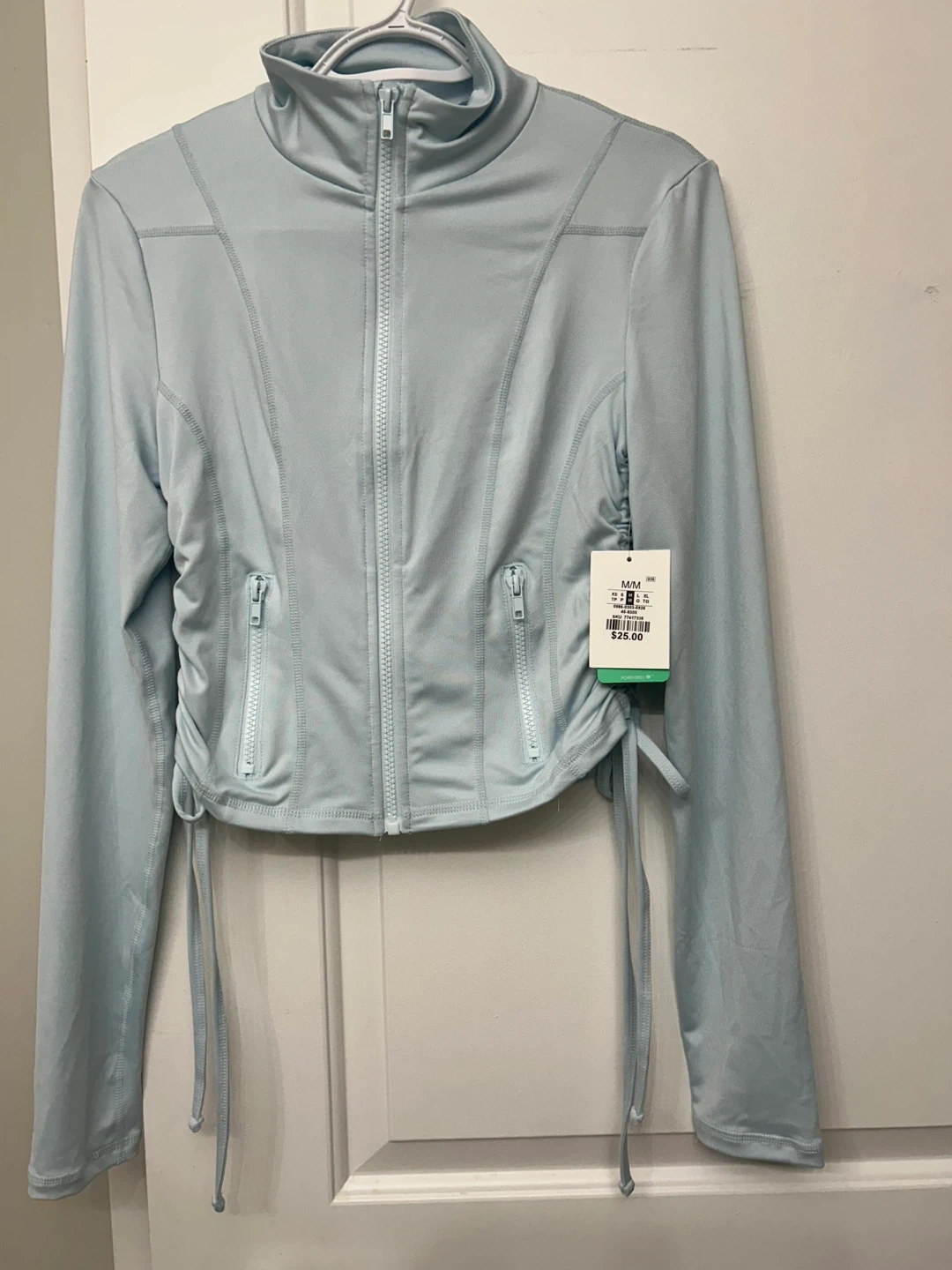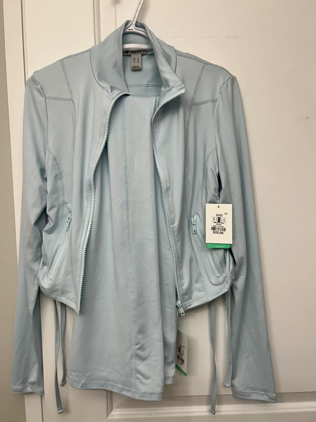 Selling a cute Forever 21 activewear set! The set includes a jacket and a pair of pants, both in a light blue colour. The tag shows the original price for the jacket was $25. Perfect for workouts or just lounging around! Both for $50, open to offers.