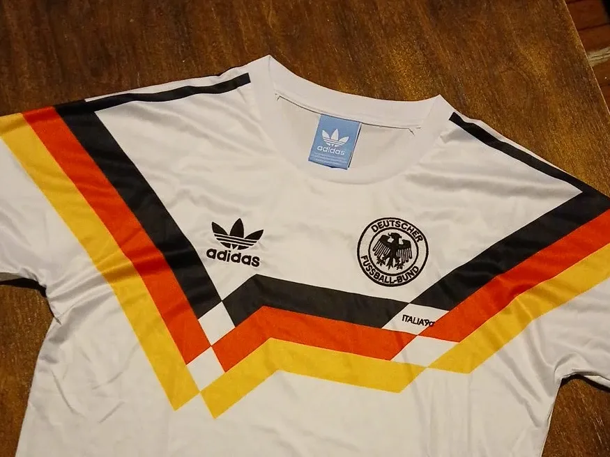 Classic Adidas Germany football jersey from Italia '90. Features the iconic black, red, and yellow stripe design. It's a must-have for football fans and collectors!