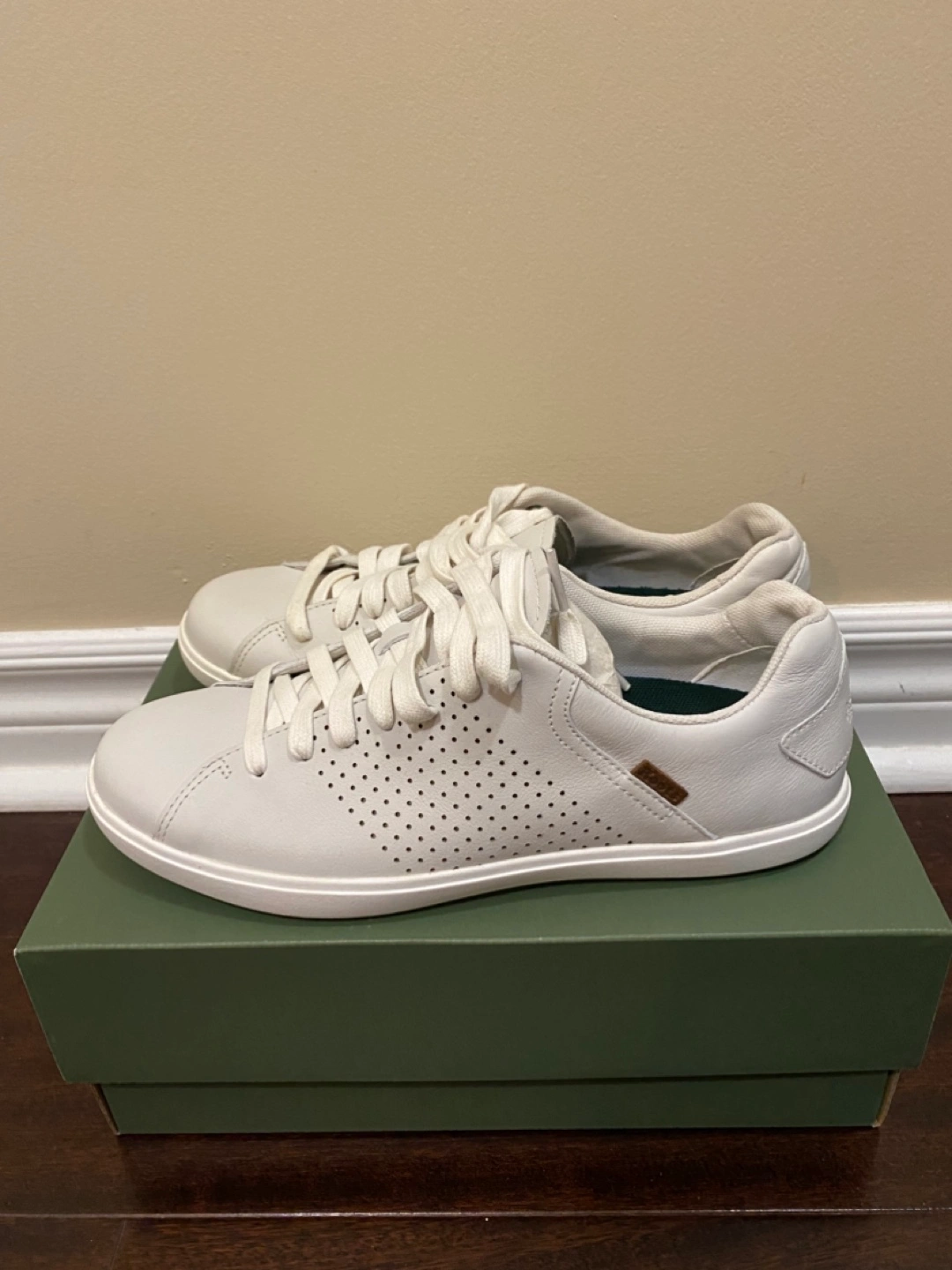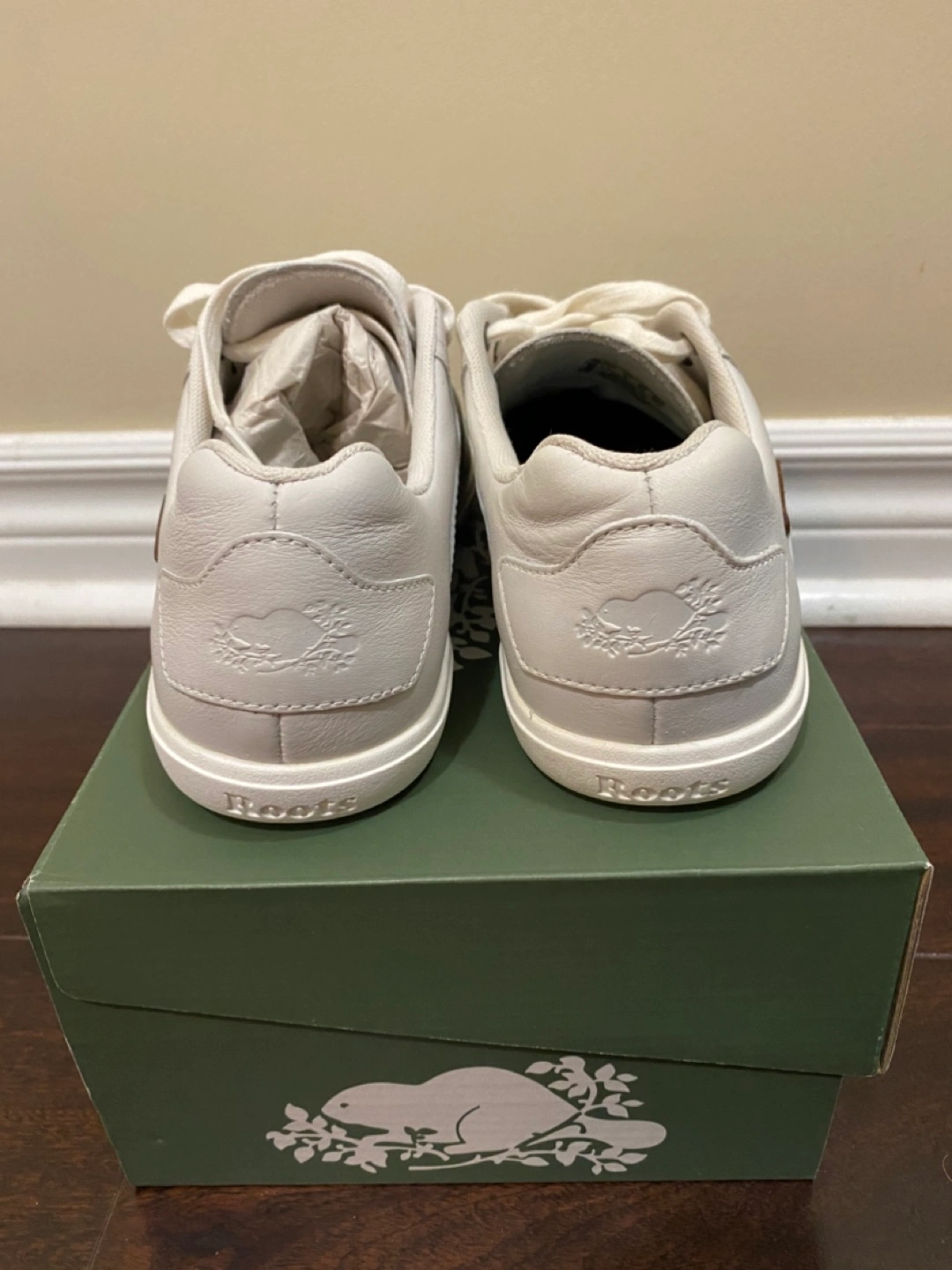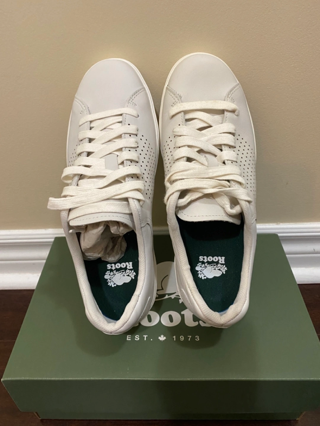Pair of brand new Roots off-white leather sneakers. Lace-up closure. Perforated detailing. Comes in original box.