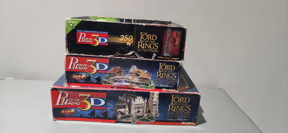 Three iconic Wrebbit Lord of the Rings 3D puzzles for sale: Orthanc Tower (350 pieces), Hobbiton (369 pieces), and Citadel of Minas Tirith (819 pieces).