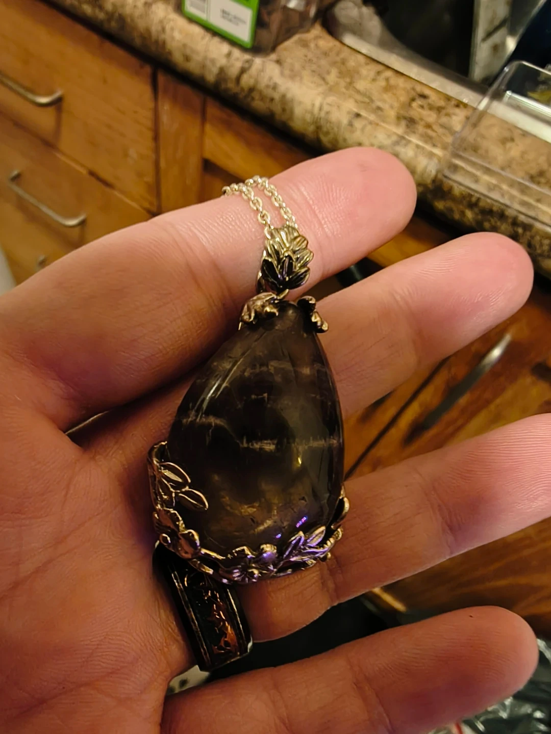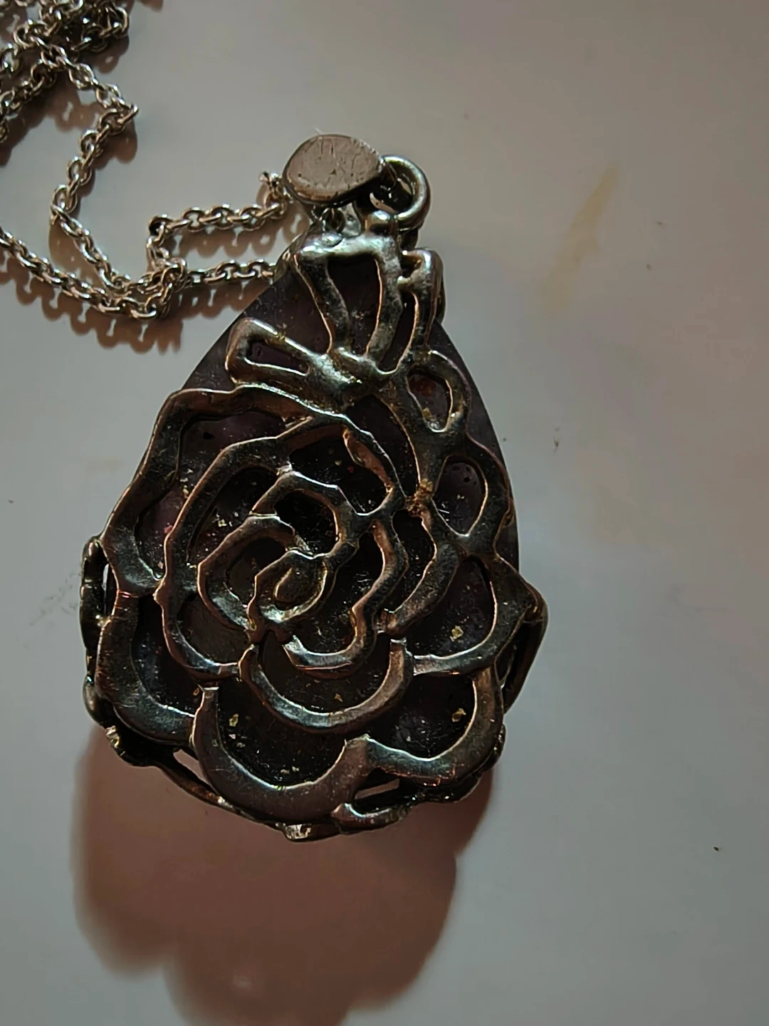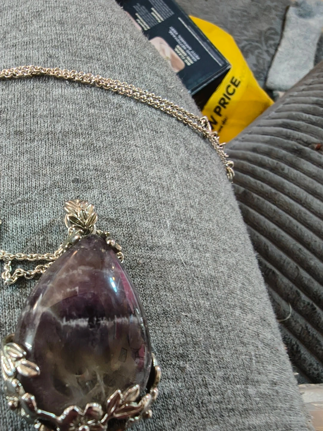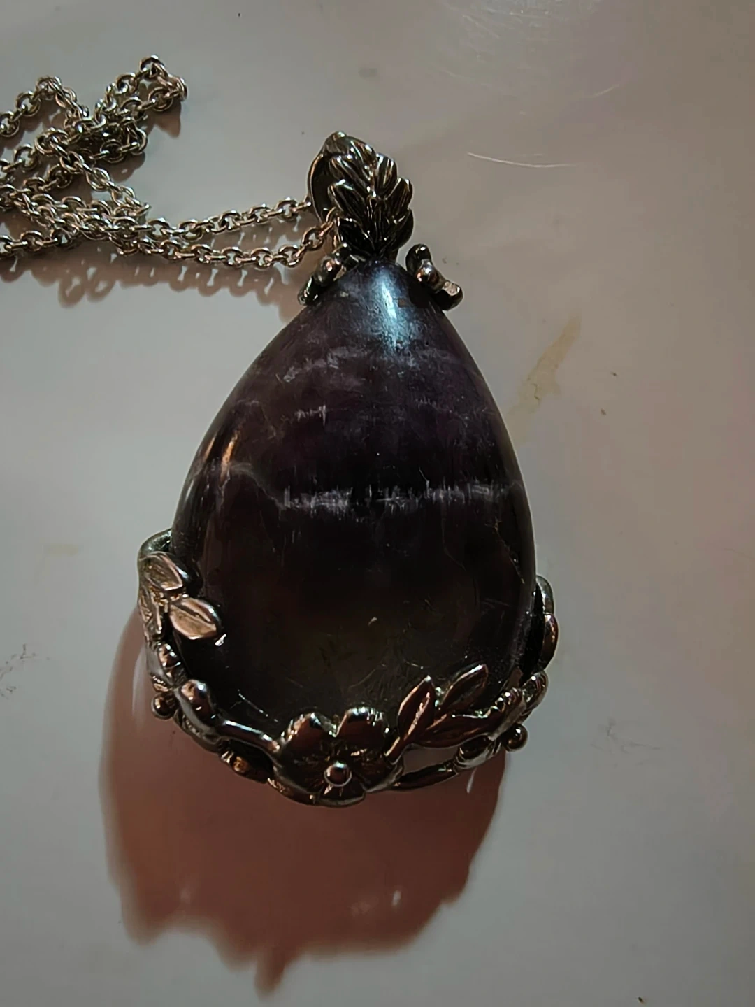 Large, tear-drop shaped dark amethyst pendant with a silver-tone wire-wrapped setting and a fine silver-tone chain. The chain is adjustable with a lobster clasp closure.