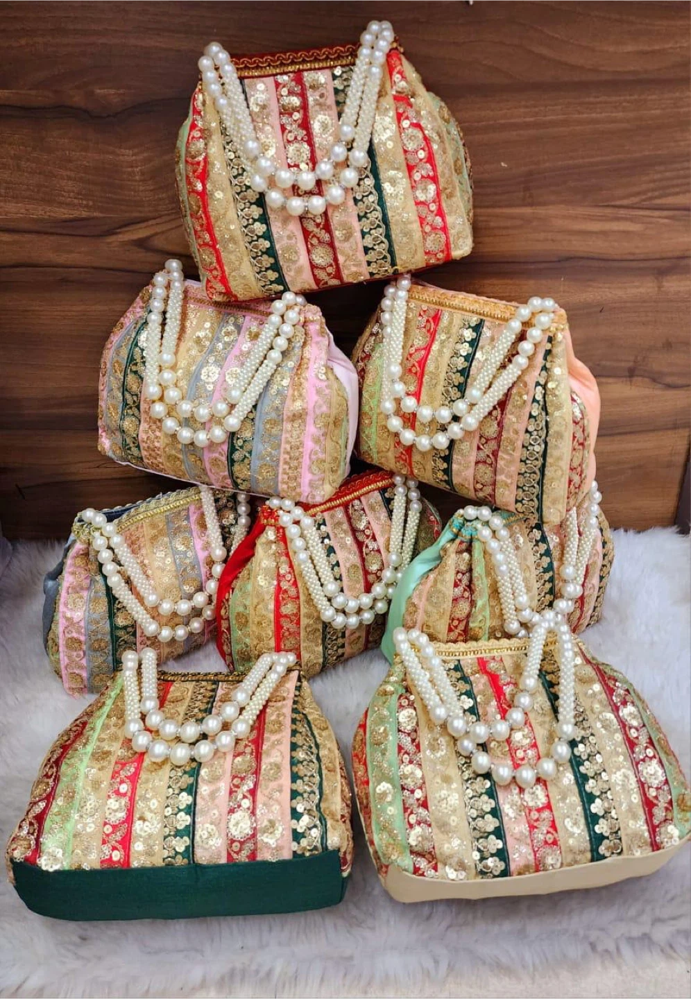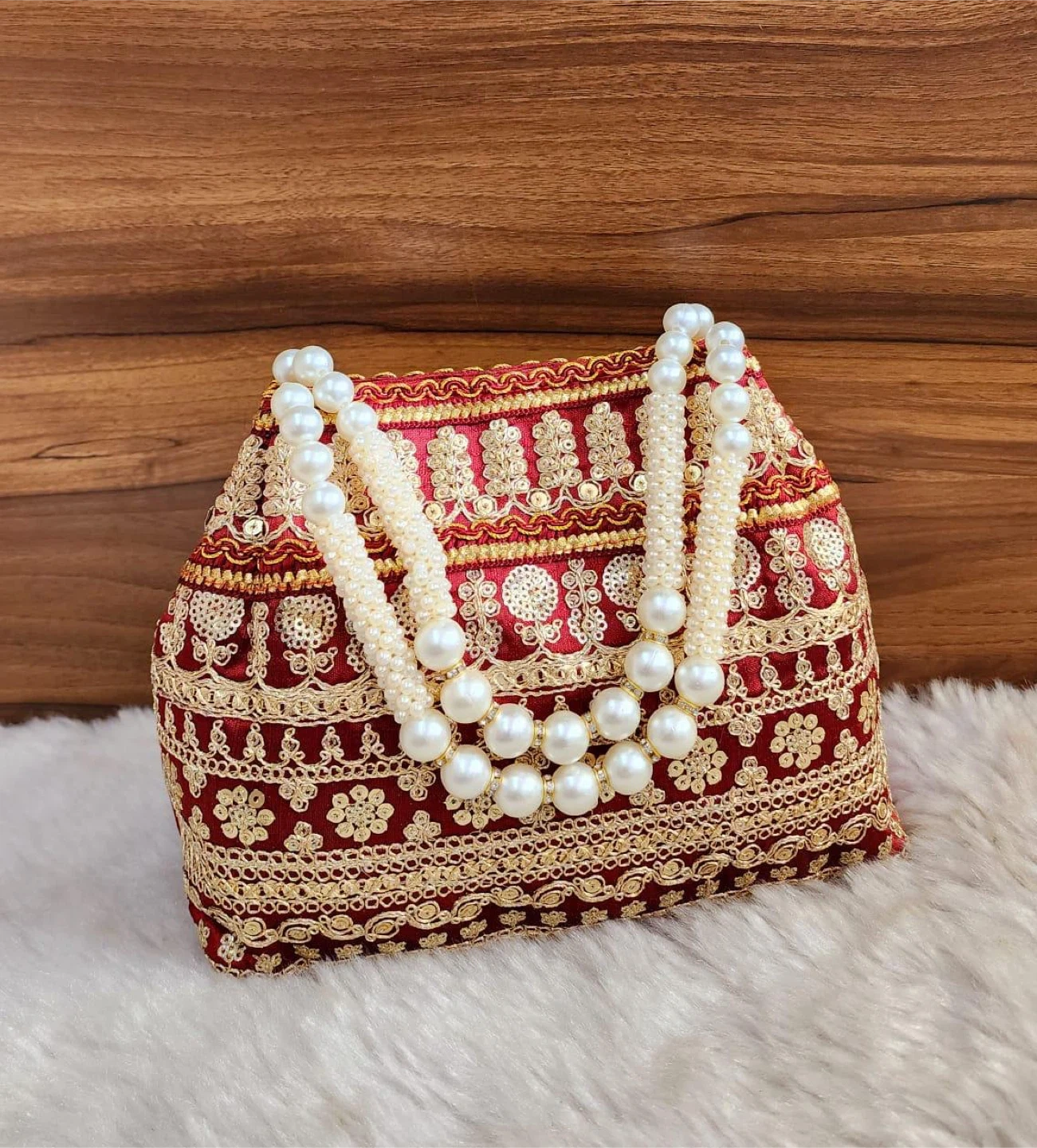 This festive clutch bag is adorned with intricate embroidery and pearl handles. It measures approximately 8.5 inches wide and 7 inches tall. The interior lining is red satin.