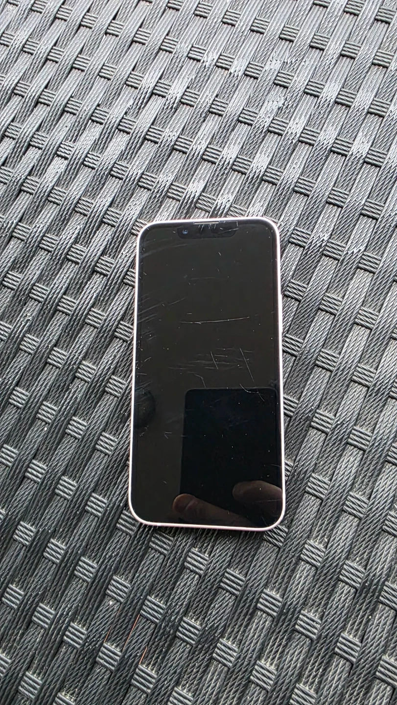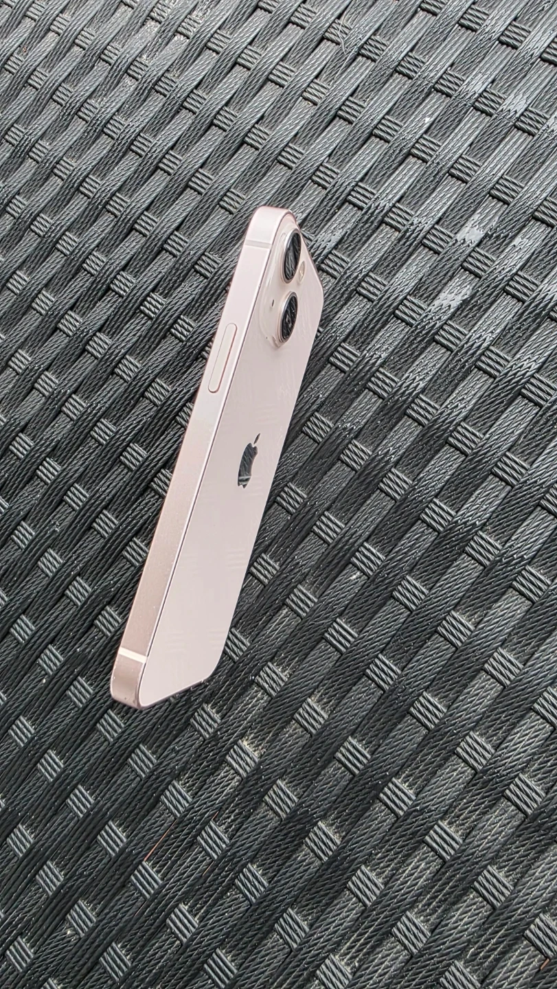 This is an Apple iPhone 13 mini in rose gold. It has a dual-camera system and a vibrant display. The phone's frame is made of aluminum frame.